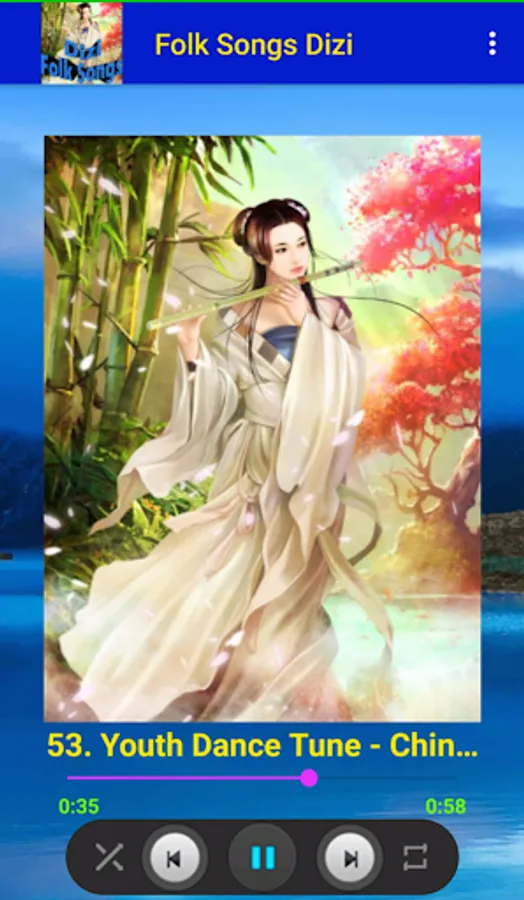 This app consists of the most popular folk songs cover by Dizi music such as Beautiful Flowers Under The Full Moon - 花好月圆, Gu Sou Heng - Gu Su Xing - 姑苏行, Jasmine Flower - Muo Li Hua - 茉莉花, Three Five Seven - San Wu Qi - 三五七, etc.