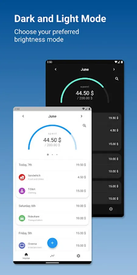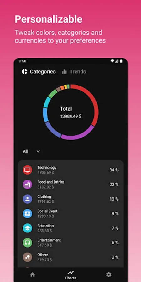 • Set your preferred currency, color theme or create new purchase categories