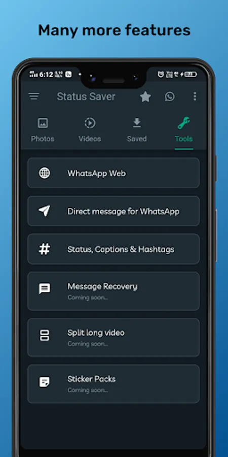 ☆ Tool section is there to send direct message, new status, split video, Whatsapp web, deleted message recovery, sticker packs.