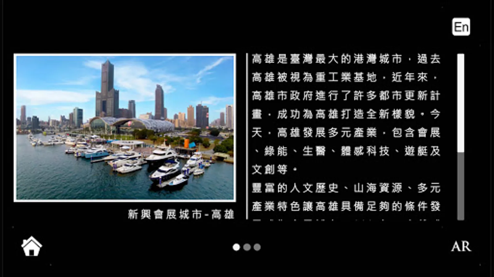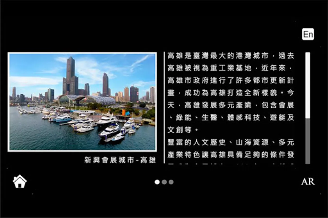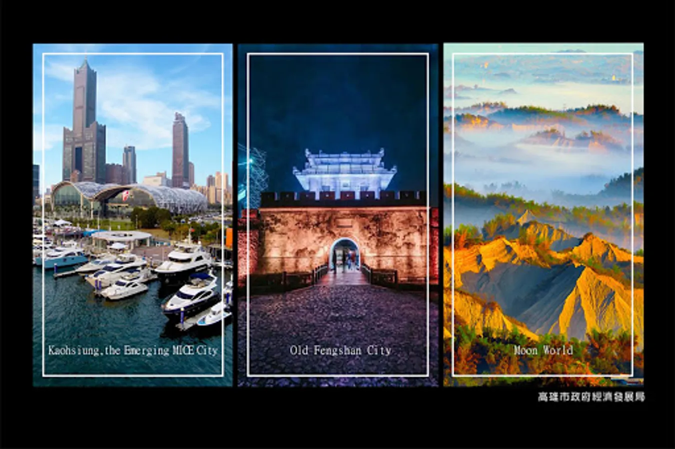 Kaohsiung is the largest harbor city in Taiwan. In the past, Kaohsiung was regarded as a heavy industry base. In recent years, the Kaohsiung City Government has carried out many urban renewal projects and successfully created a new look for Kaohsiung. Today, Kaohsiung develops diverse industries, including exhibitions, green energy, biomedical sciences, somatosensory technology, yachts and cultural creations.
