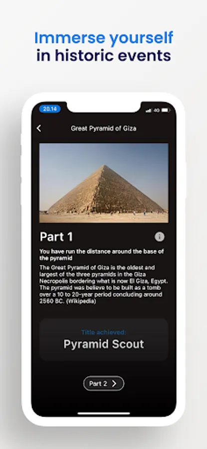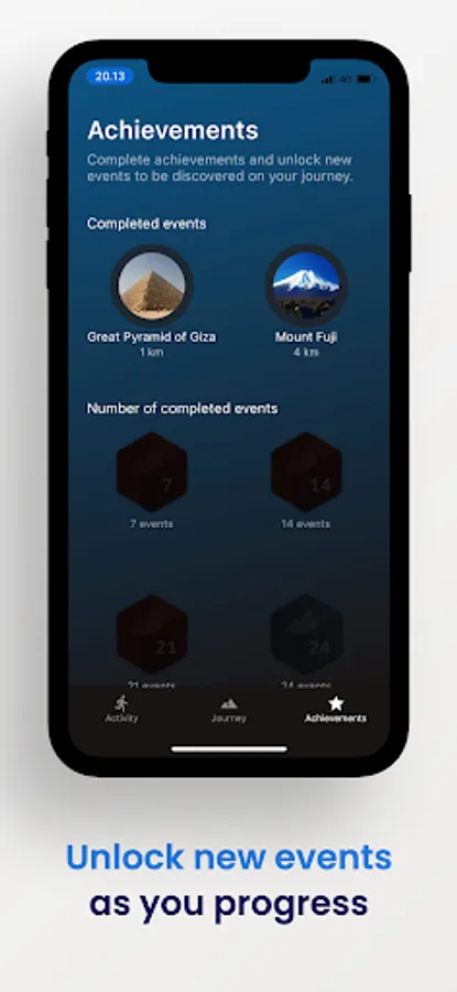 With Run Journey, your workouts start a journey across spectacular historical and geographical events. As you run, you progress through events that are discovered when you reach their distance. As you uncover events, you can immerse yourself in their history and complete achievements to unlock new events.