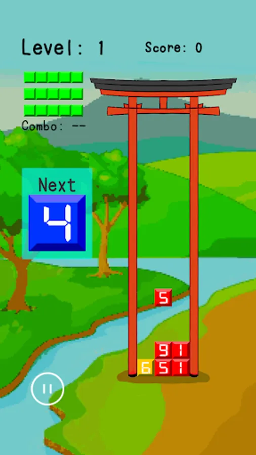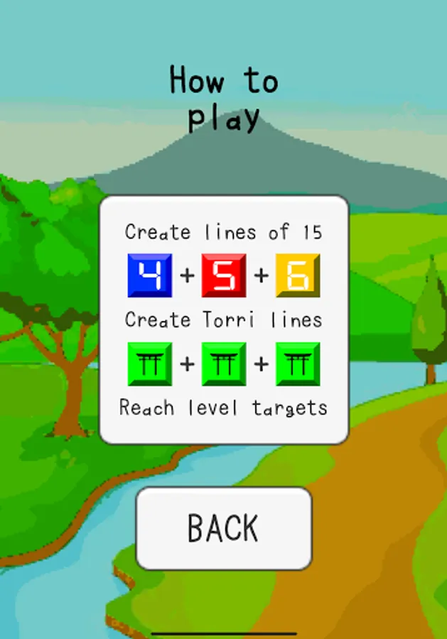 Line up the blocks to make 15. Try to clear as many levels as you can by clearing Torii blocks.