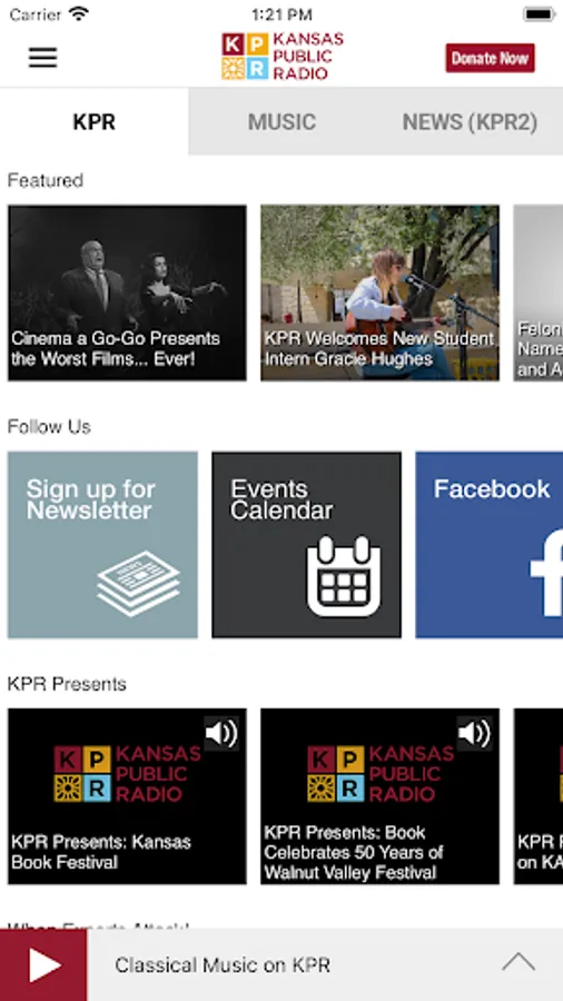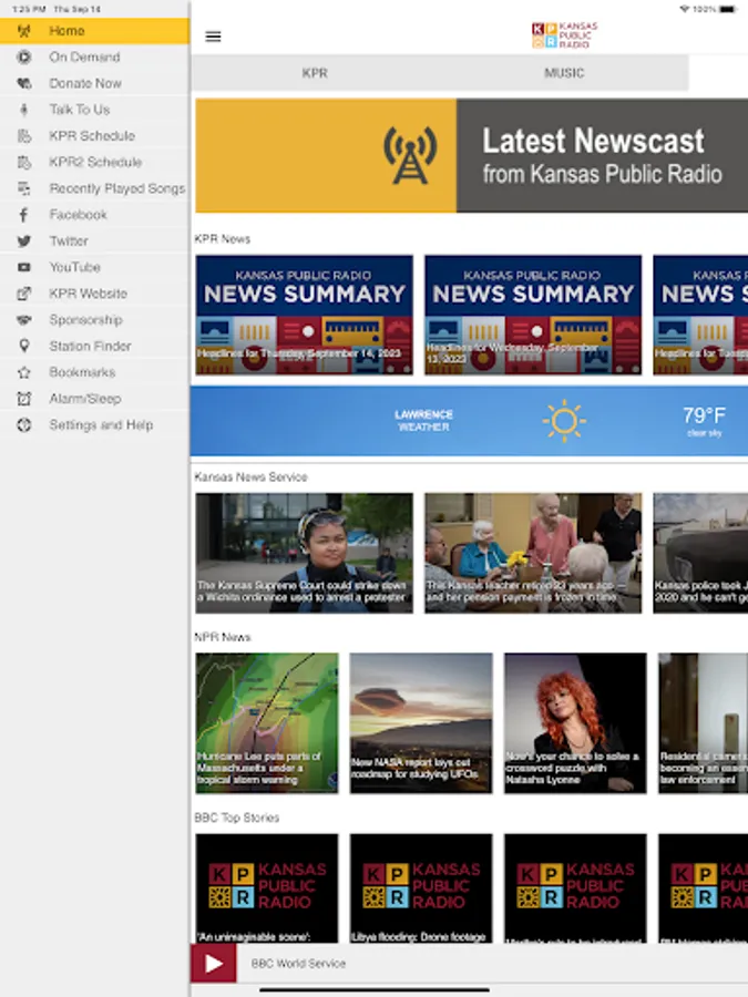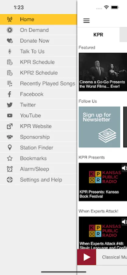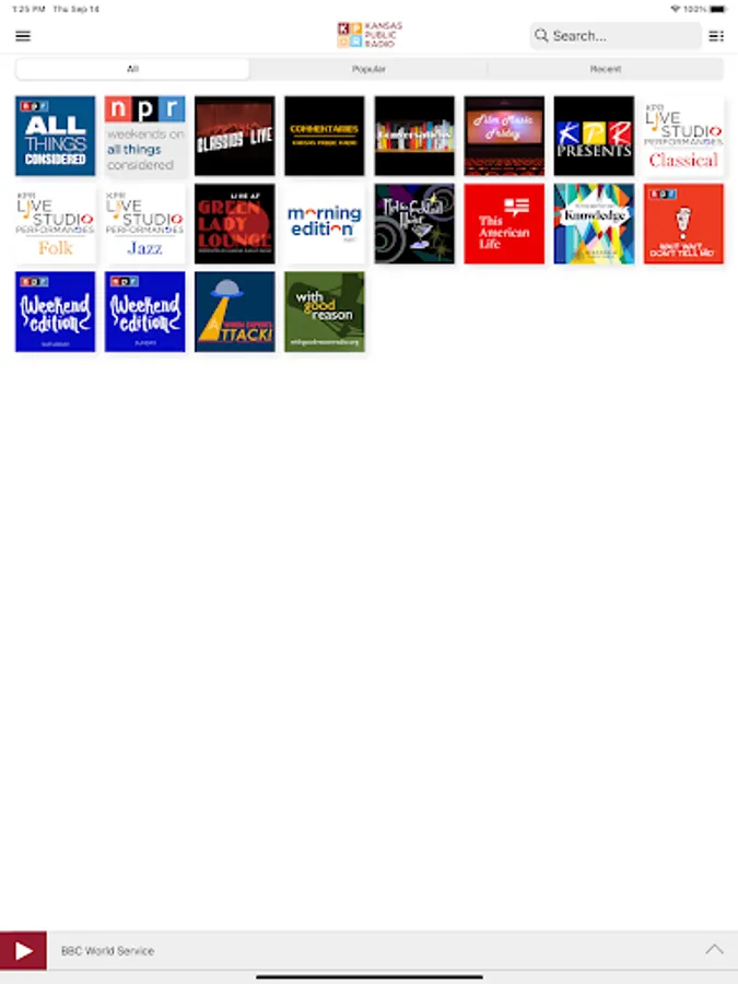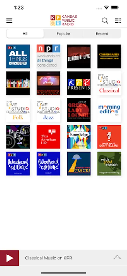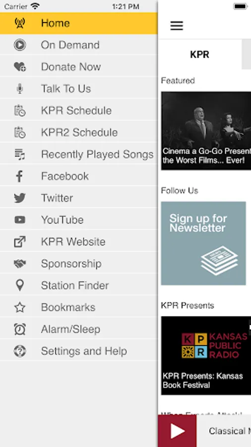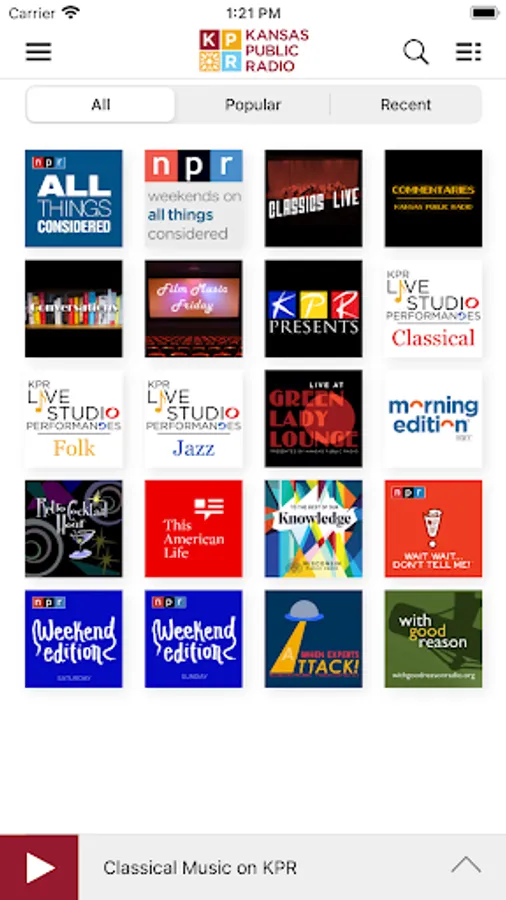 The Kansas Public Radio App allows you to listen to KPR live, pause and rewind the live audio, and view the KPR program schedules! You can explore On Demand content, search for stories, bookmark a story for later, and wake up to KPR with the alarm clock!
