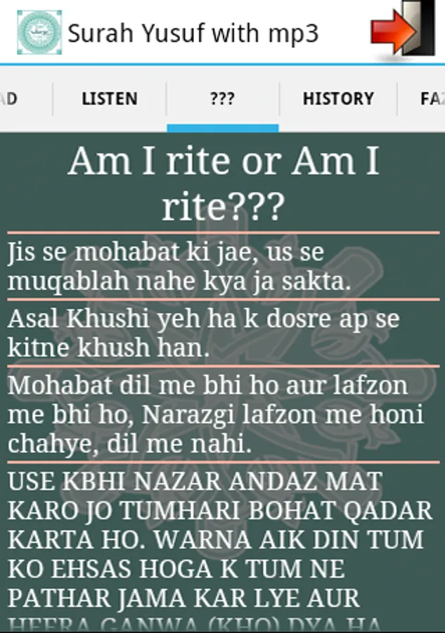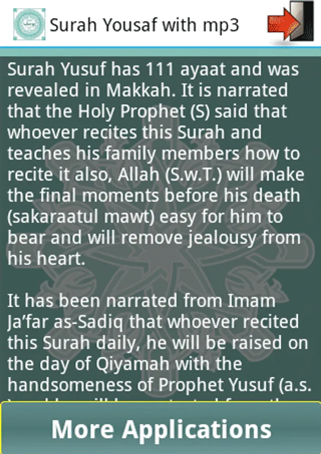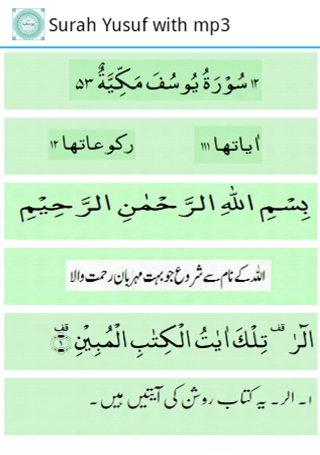 • It includes audio/mp3 and written text of Surah Yusuf along with the translation /tarjuma – available in Urdu.