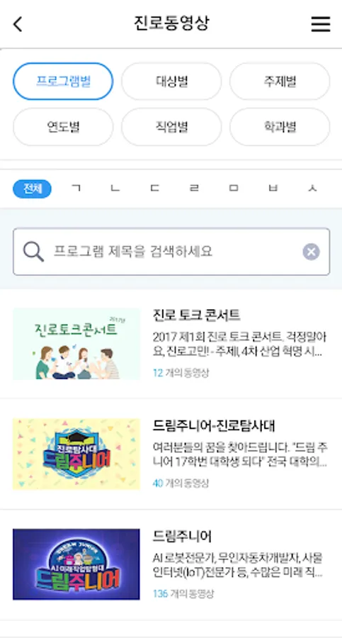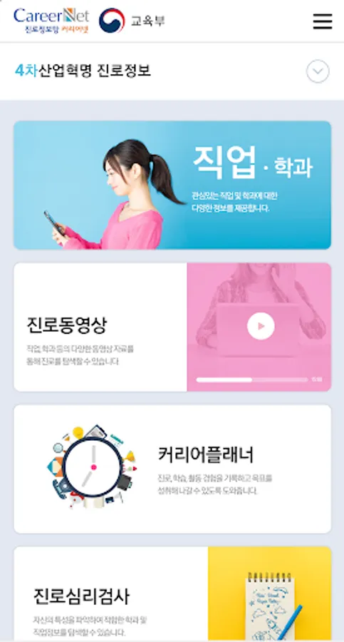 4. 진로동영상 : 창의적인 진로선택과 올바른 경력 개발을 위한 다양한 진로직업 교육용 멀티미디어 콘텐츠를 제공합니다.