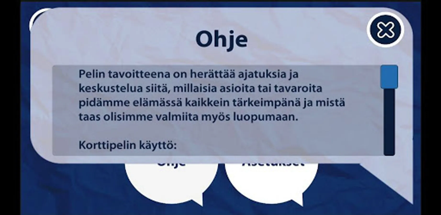 The aim of the game is to evoke thoughts and discussion about what kind of things or things we consider most important in life and what we would be willing to give up.