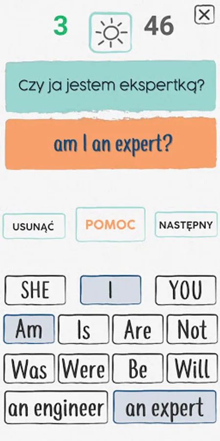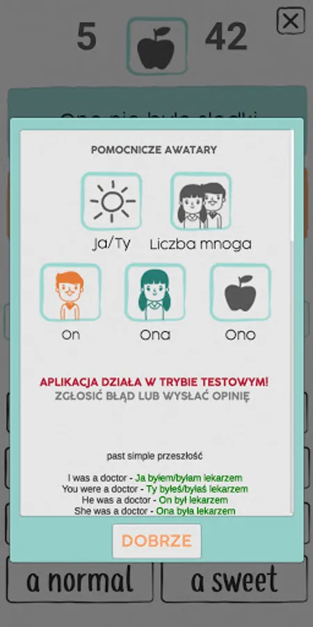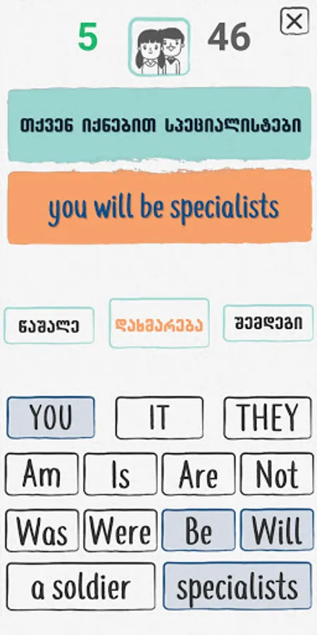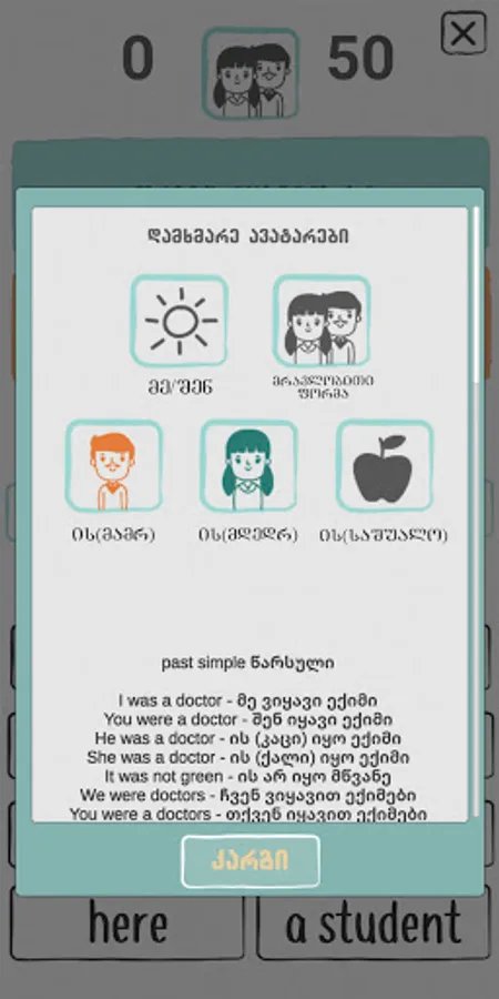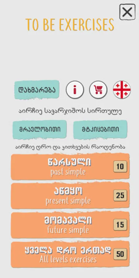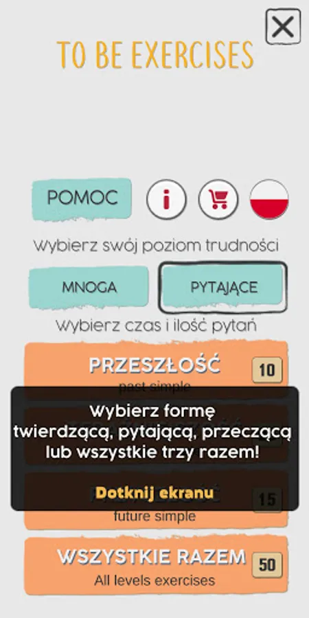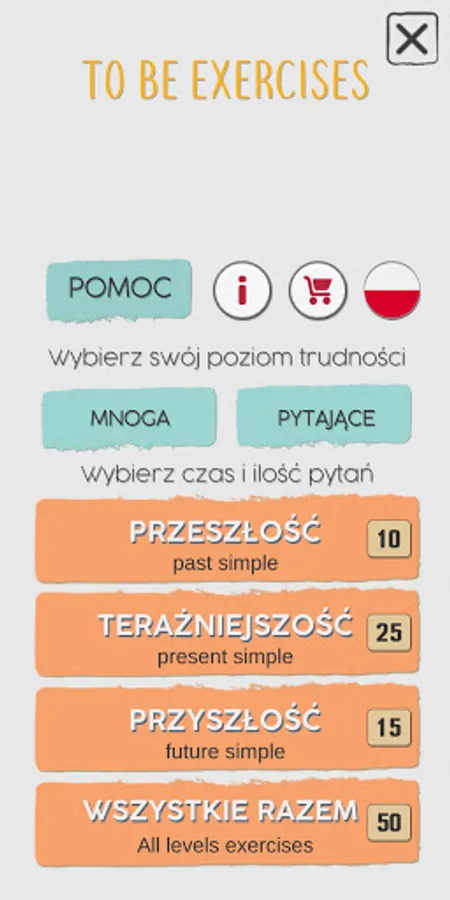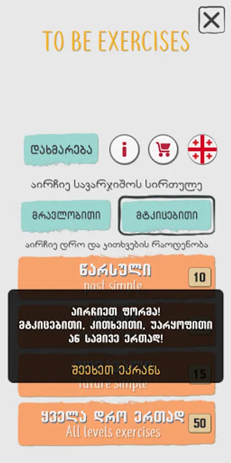 The app allows you to choose the singular and plural forms of To be, as well as affirmative, negative and interrogative forms.