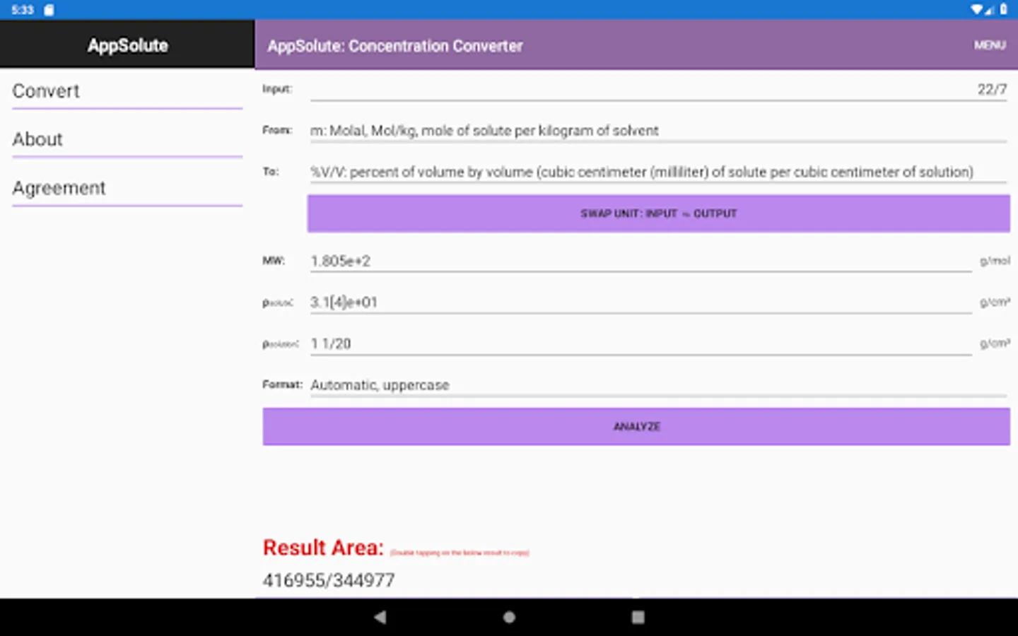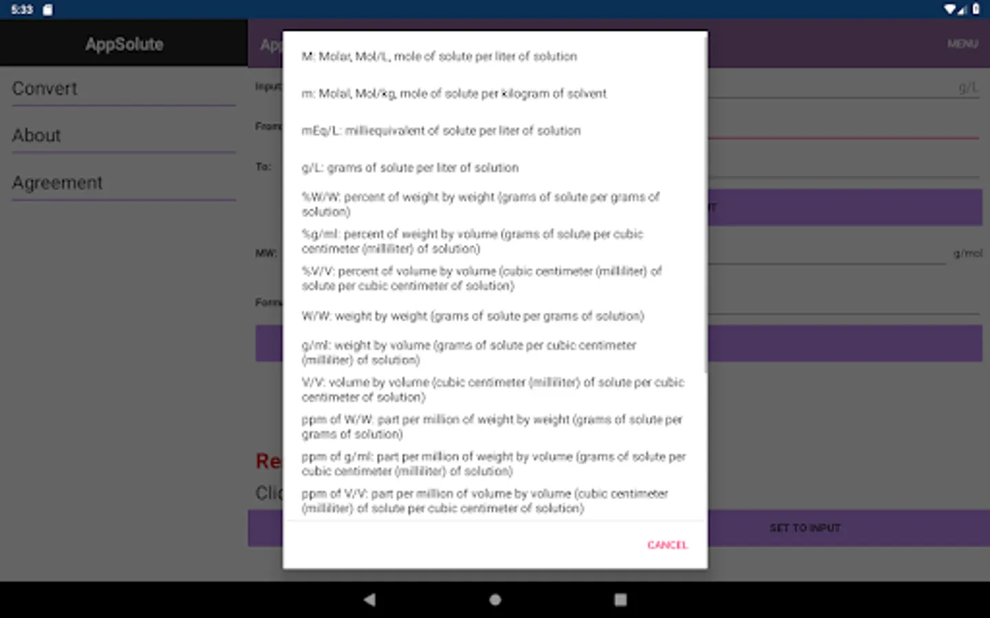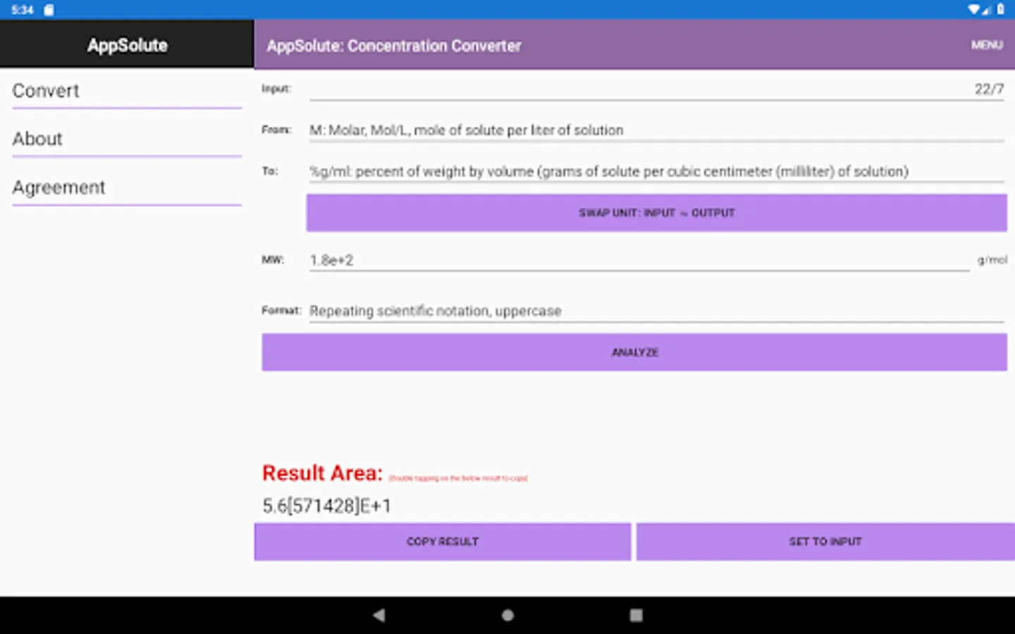 AppSolute (Lite) is the concentration unit converter. It can convert 5 units,