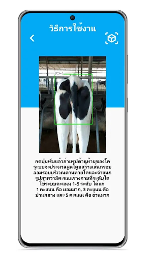 Is an application used to help assess the body score of dairy cows, especially It uses artificial intelligence (AI) technology to analyze photographs of the rear of dairy cows and process them into different body levels. Which uses a 1-5 rating system, namely 1 point is very thin, 3 points is moderate, and 5 points is very obese, which makes it easier to assess the body of dairy cows. high precision and correct according to academic principles