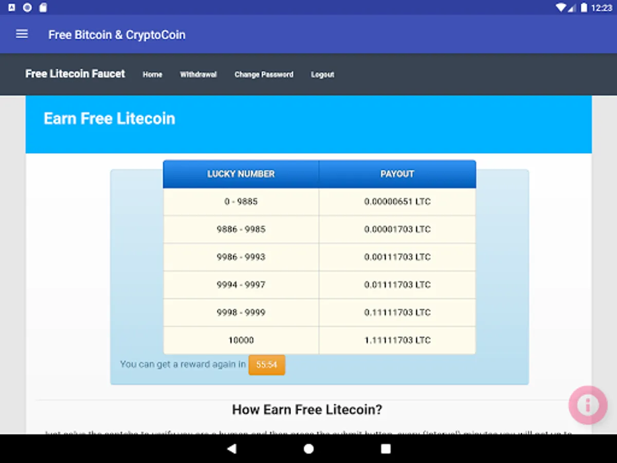 - Earn every hour free Litecoin up to 1.11 LTC and minimum 0.00001096 litoshi