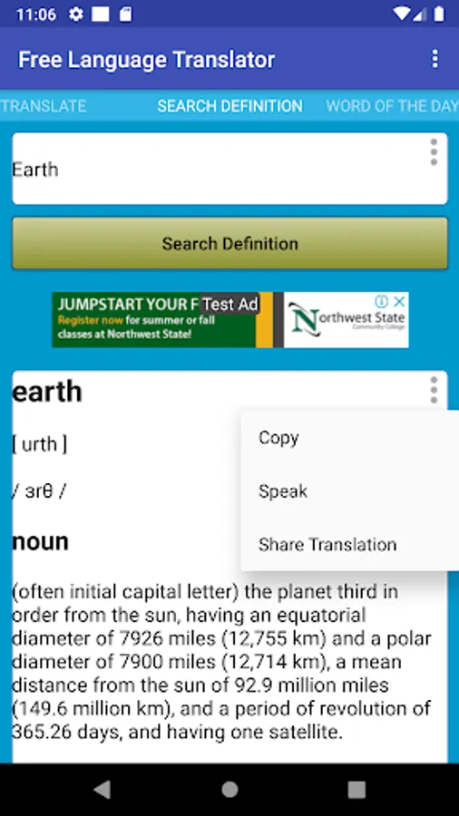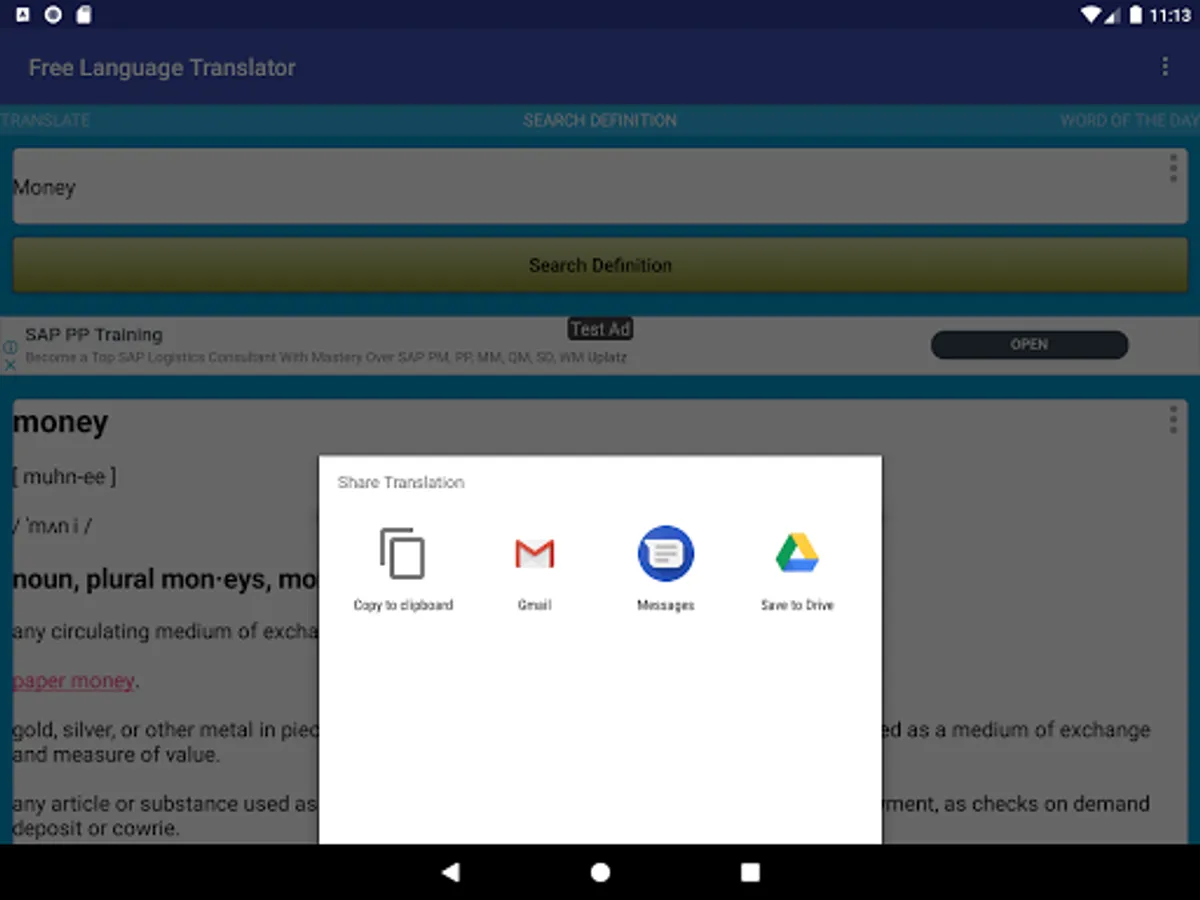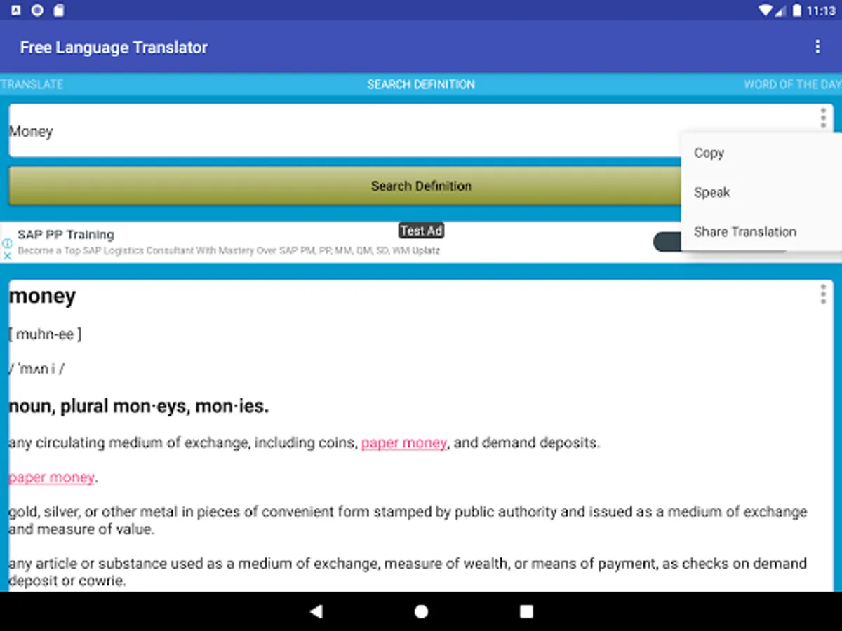 You can choose to copy/paste/speak of search and result items. (Speak functionality only pronounce languages that is already installed your mobile phone).