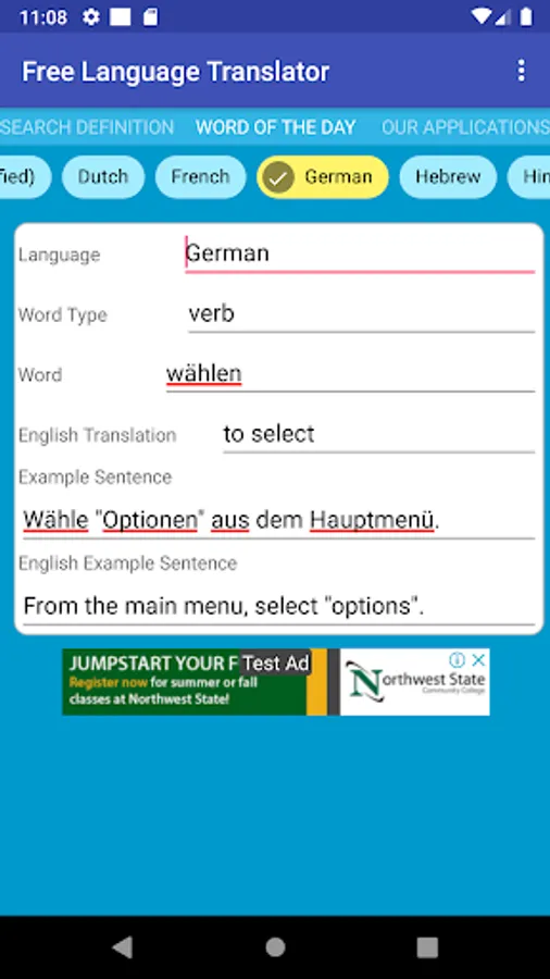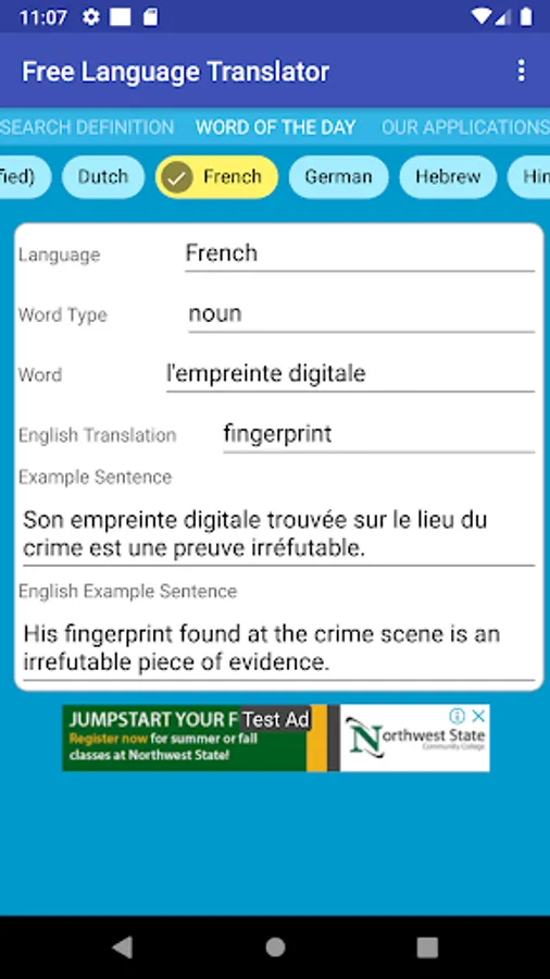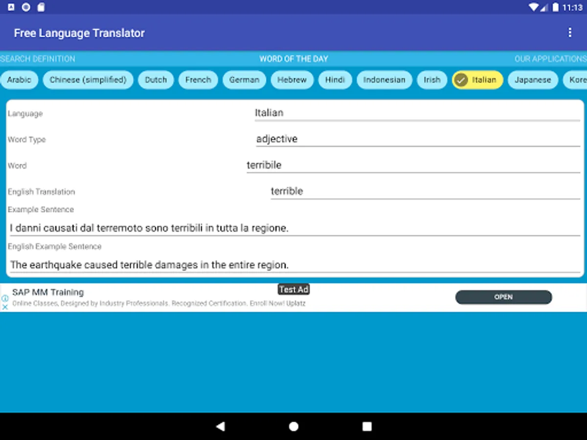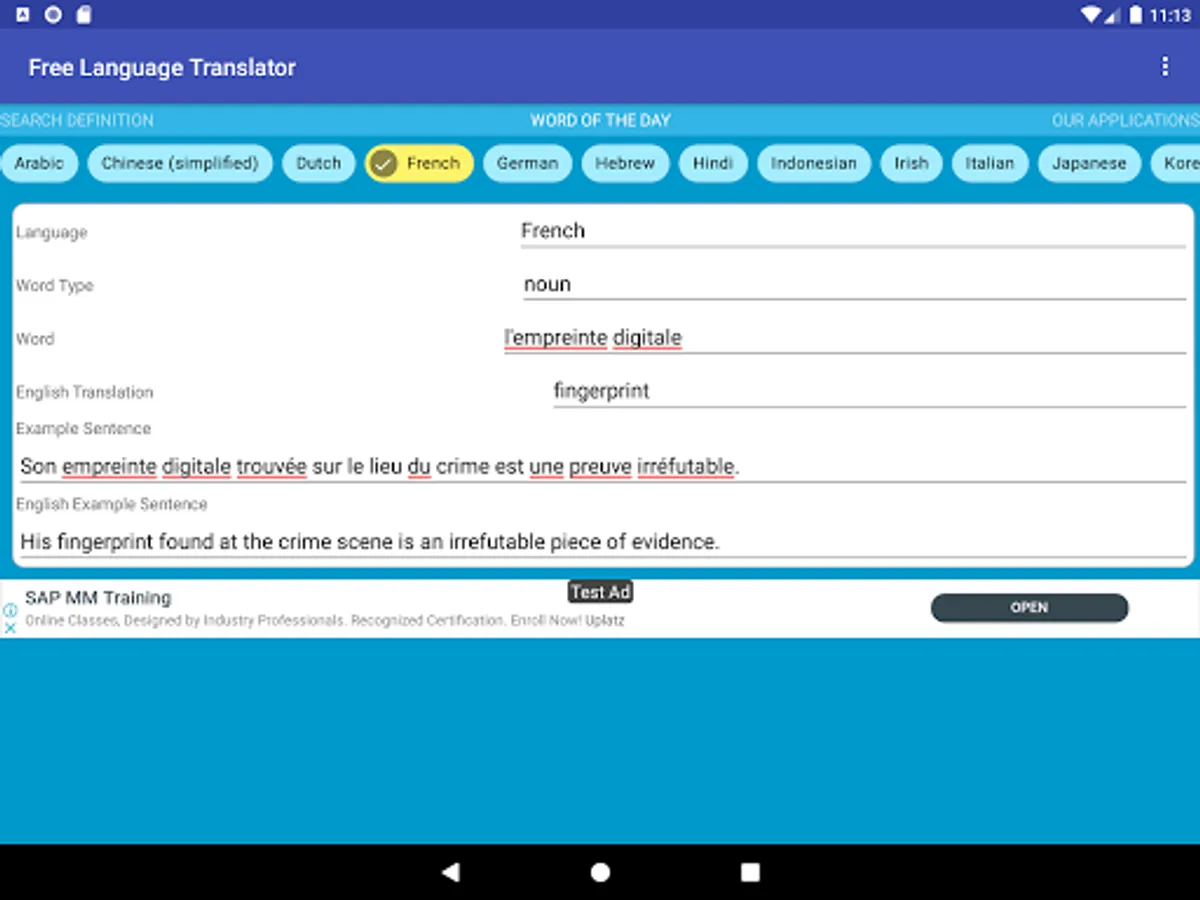 - Every day you can check word of the day section for new words from Arabic, Chinese, Dutch, French, German, Hebrew, Hindi, Indonesian, Italian, Japanese, Korean, Latin, Norwegian, Polish, Portuguese, Russian, Spanish, Swedish, Turkish, Urdu.