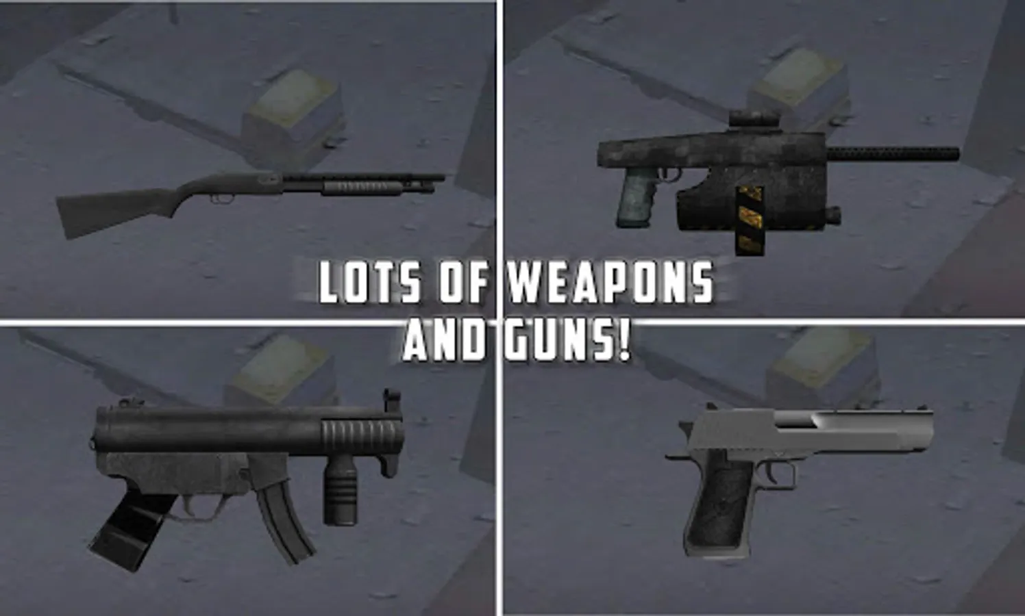 » 4 guns (all 3D): a pistol Desert Eagle, a submachine MP5, a shotgun M87T and an assault rifle STW 25.