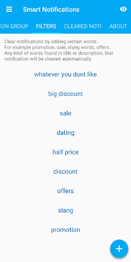 You can clear notifications by app name or app icon group(a unique feature) or by filtering words.