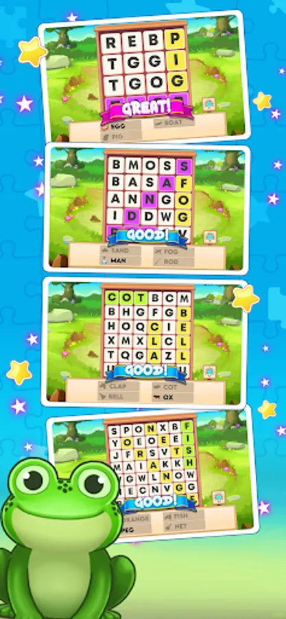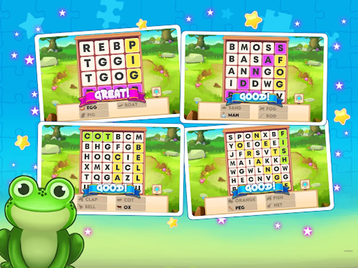 Word search helps children improve their memory and concentration skills, helping them stay focused on the task. Children search for simple 3-letters to 4-letters in a simplified version, friendly for young kids.