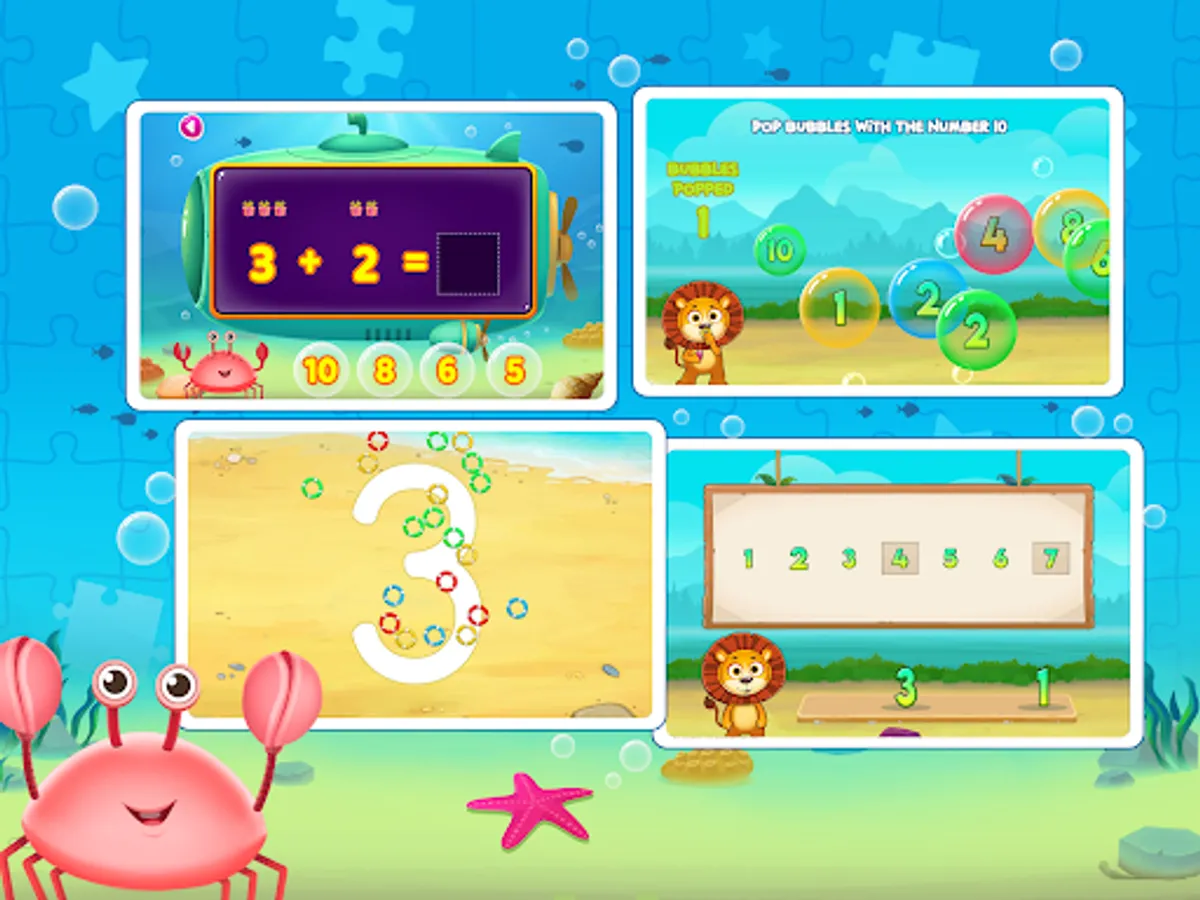 Learn numbers (1 to 10), counting, tracing, dot-to-dot puzzles, number of sides in shapes, ordering and patterns. Once your child is ready, get started with simple addition and subtraction.