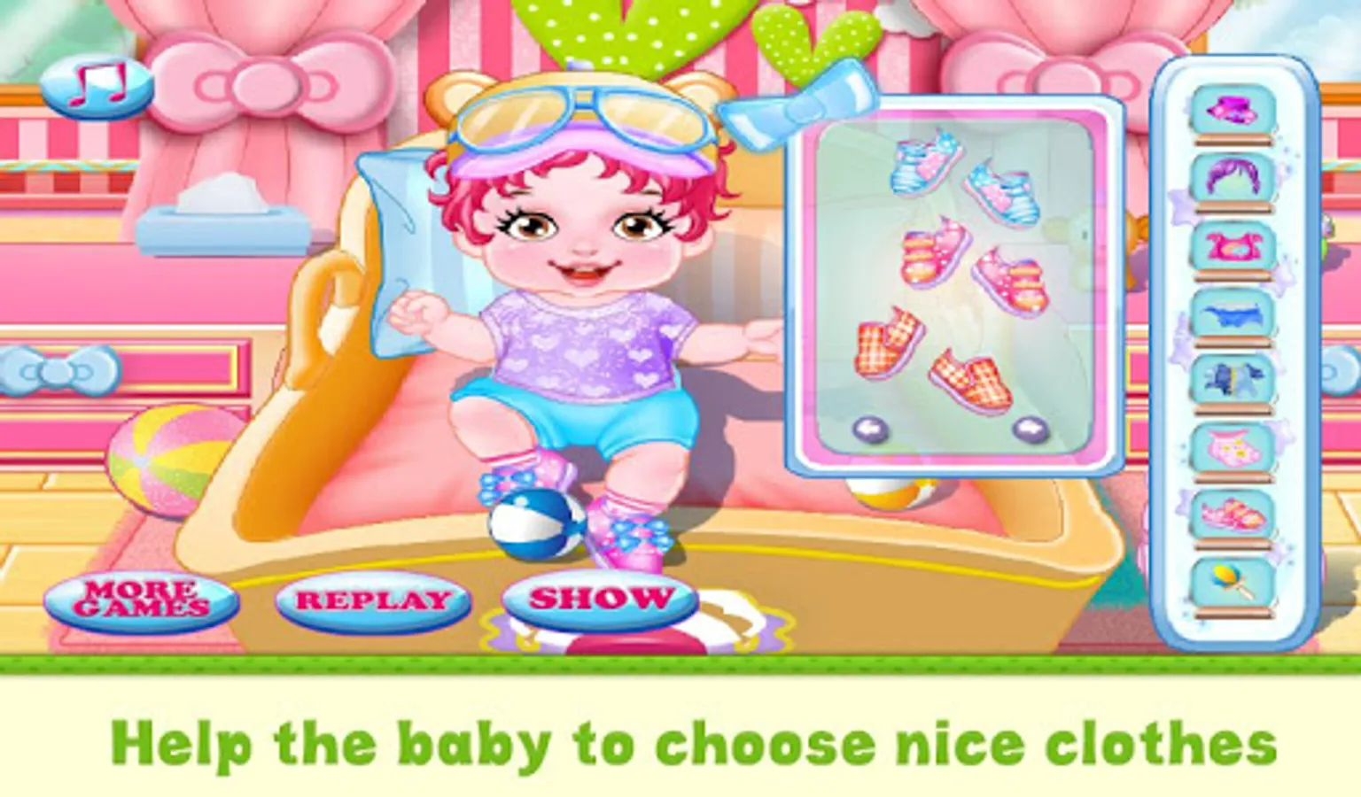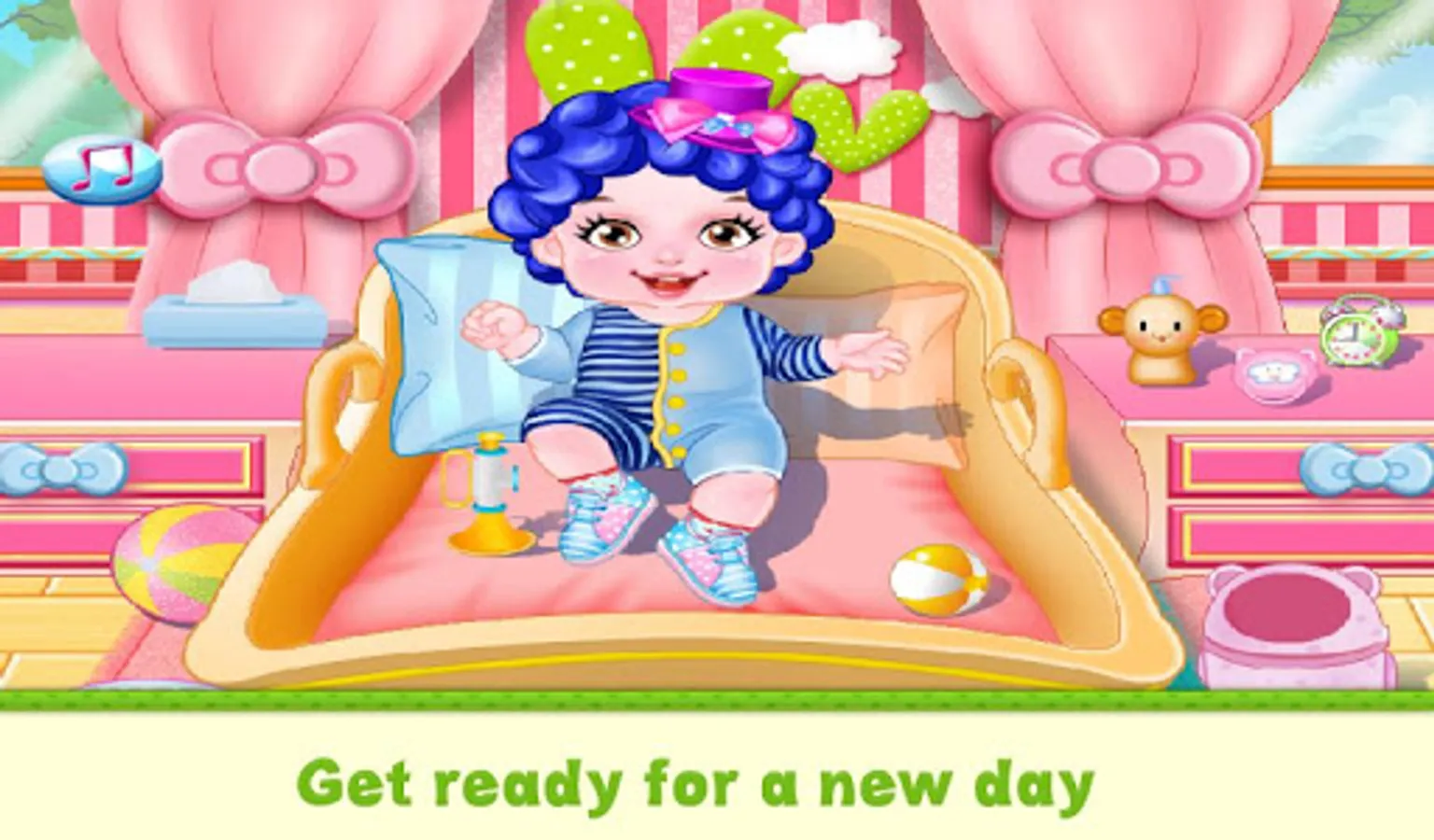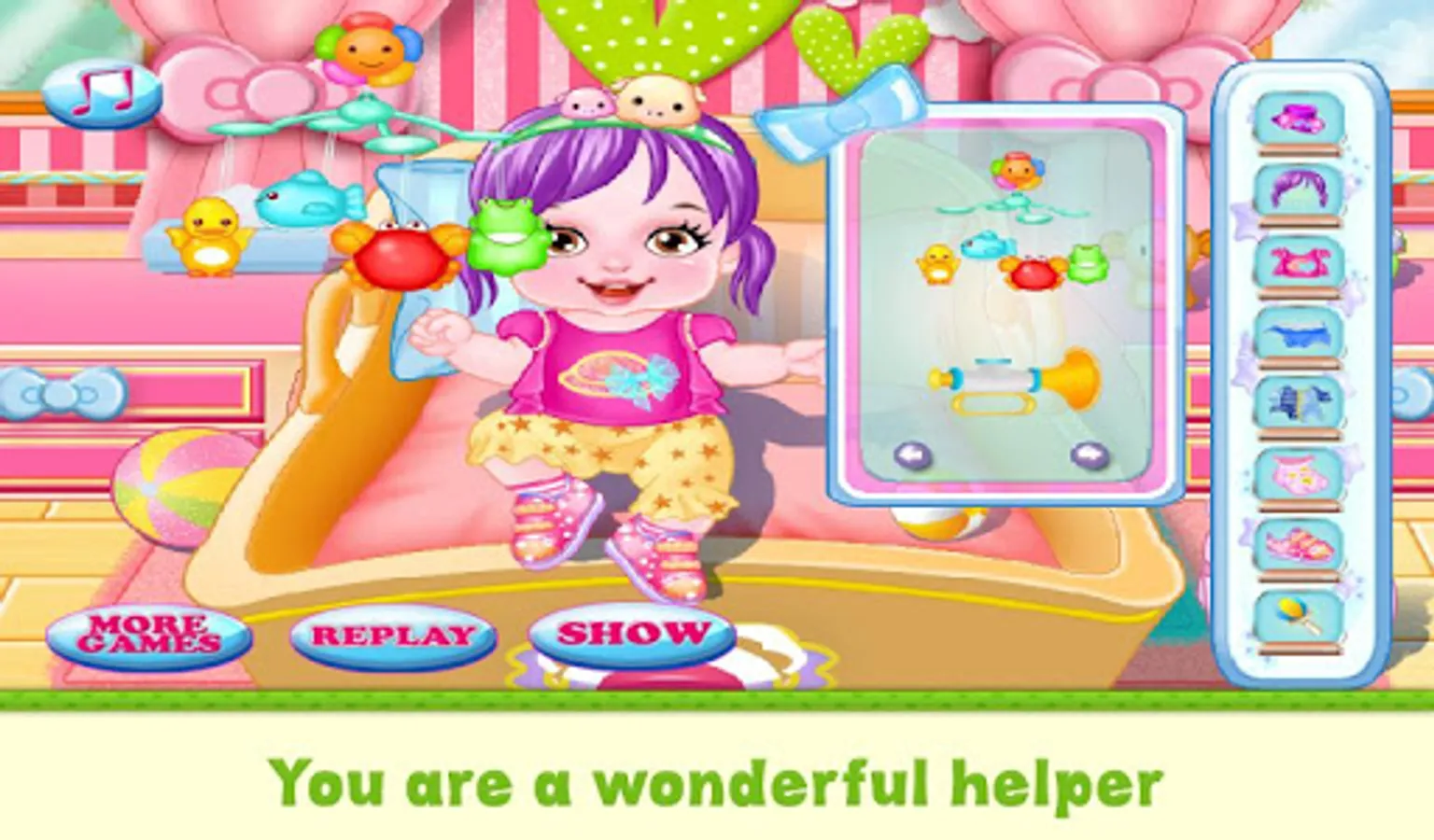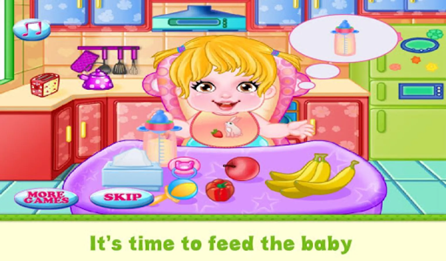 It is time to meet the little one. The baby girl is in her room, she is crying, you have to swing the crib, change the diaper, wash the baby, use cream and after that choose a clean diaper. She needs a baby pacifier and after that, she wants to play with her favorite toys. Now the kid is very happy and clean you have to prepare the breakfast. First, you must wash the fruits and vegetables, the next step is to prepare milk and feed the baby.