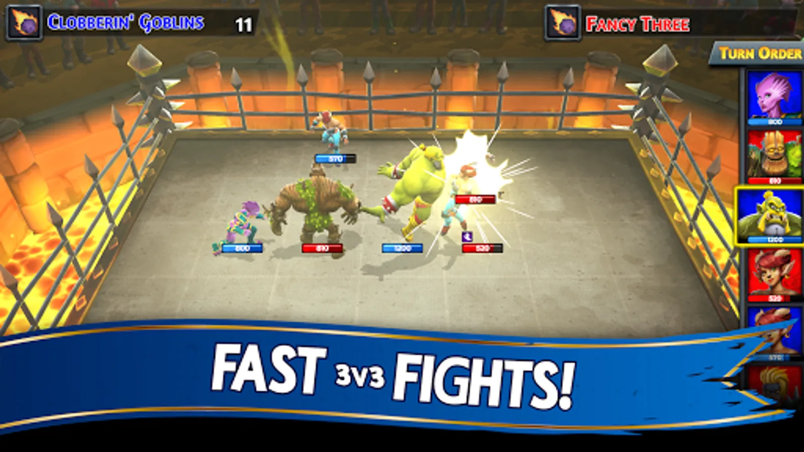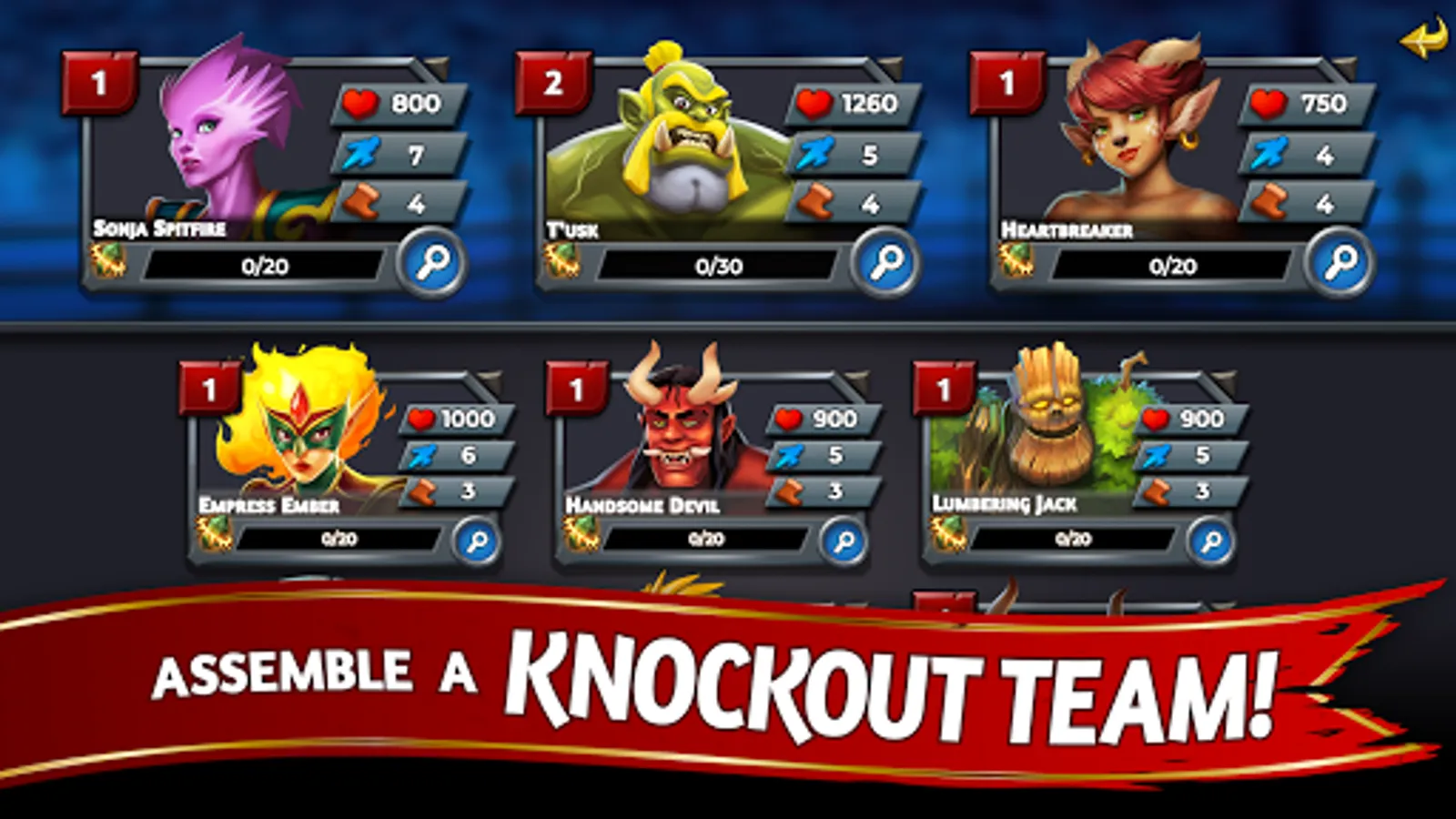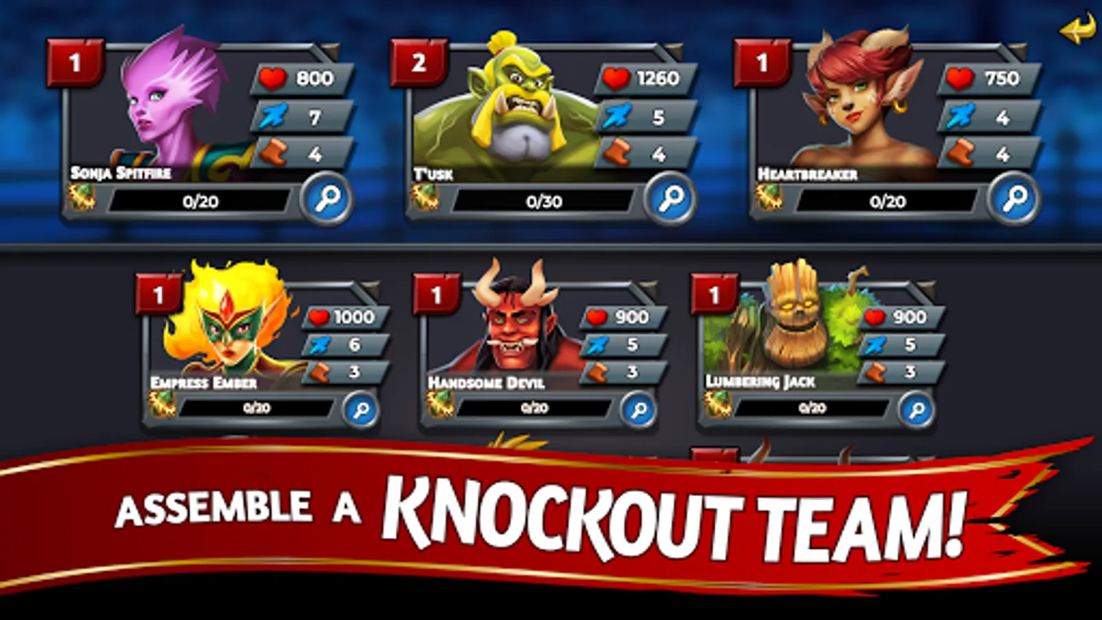 Get ready to knockout the competition! Assemble a powerful team of notorious fantasy fighters to dominate the fiery PvP arena. Battle in real-time with other players and win trophies to rank up for great rewards!