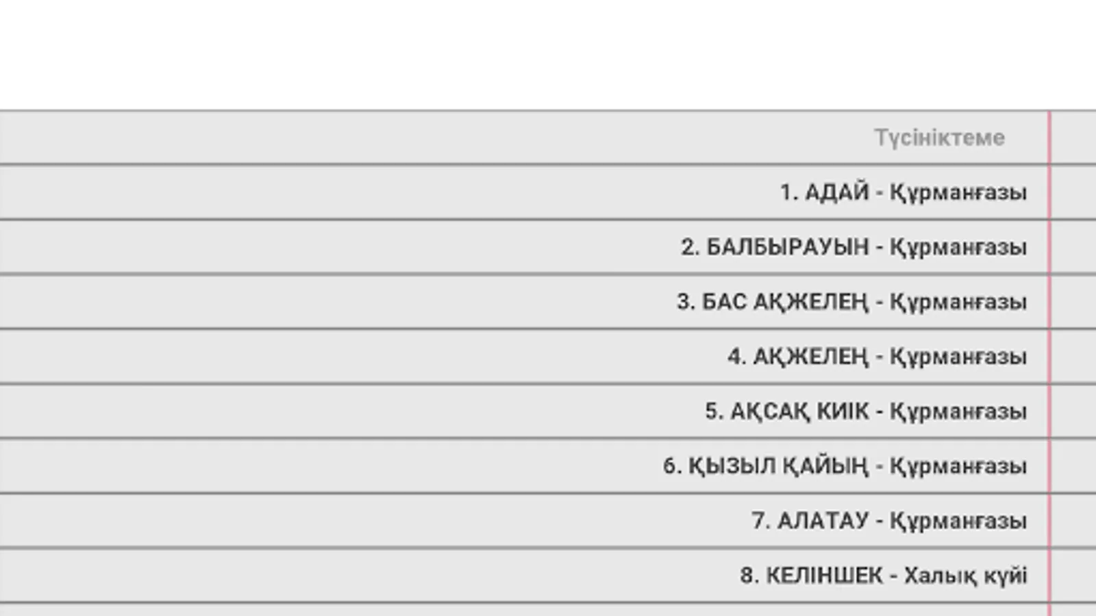 Kүylerdің tsifrlіk nұsқadaғy notalary. Modern Pentathlon uaқytta "Adai", "Balbyrauyn", "Bass aқzheleң", "Aқzheleң", "Aқsaқ kiіk", "Kyzyl қayyң", "Alatau", "Kelіnshek", "Zhұmyr қylysh" kүylerі tolyқ eңgіzіlgen