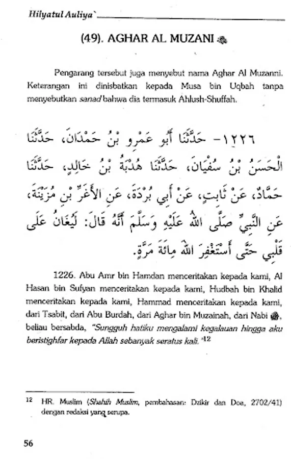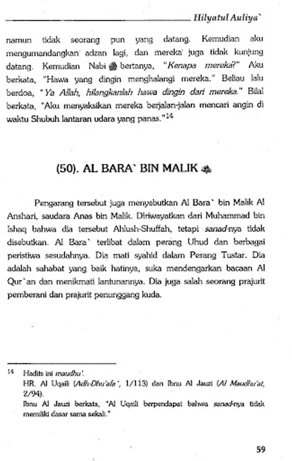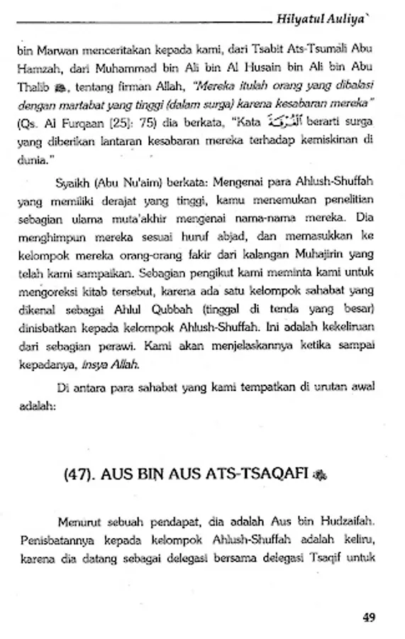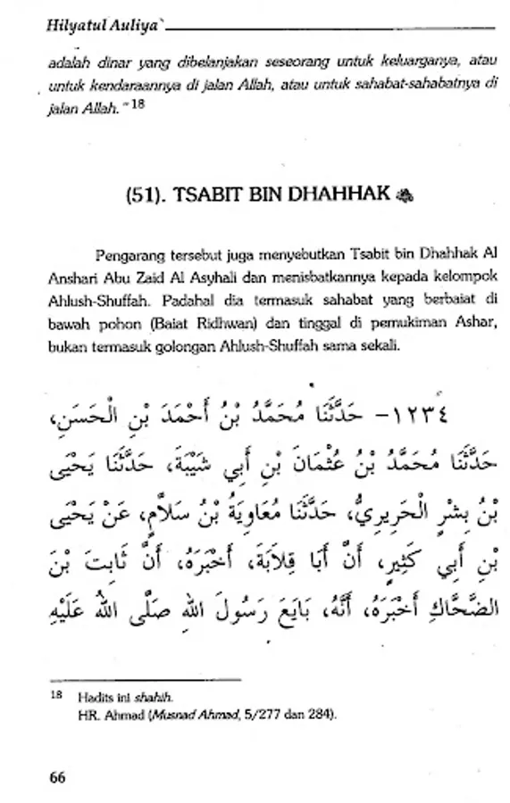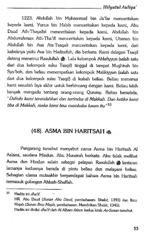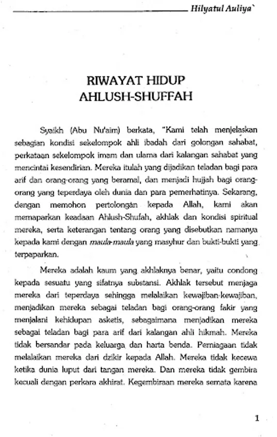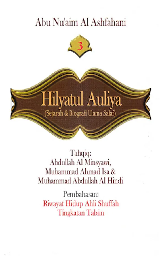 The book Hilyatul Auliya' is an Islamic encyclopedia which describes the history and biographies of the previous salaf scholars in detail. By presenting hadiths and atsars along with their sanad, Abu Nu'aim Al-Ashbahani recounts the life history of generations of Islam, starting from the generation of companions, tabi'in, tabi' at-tabi'in and so on in an authentic manner.