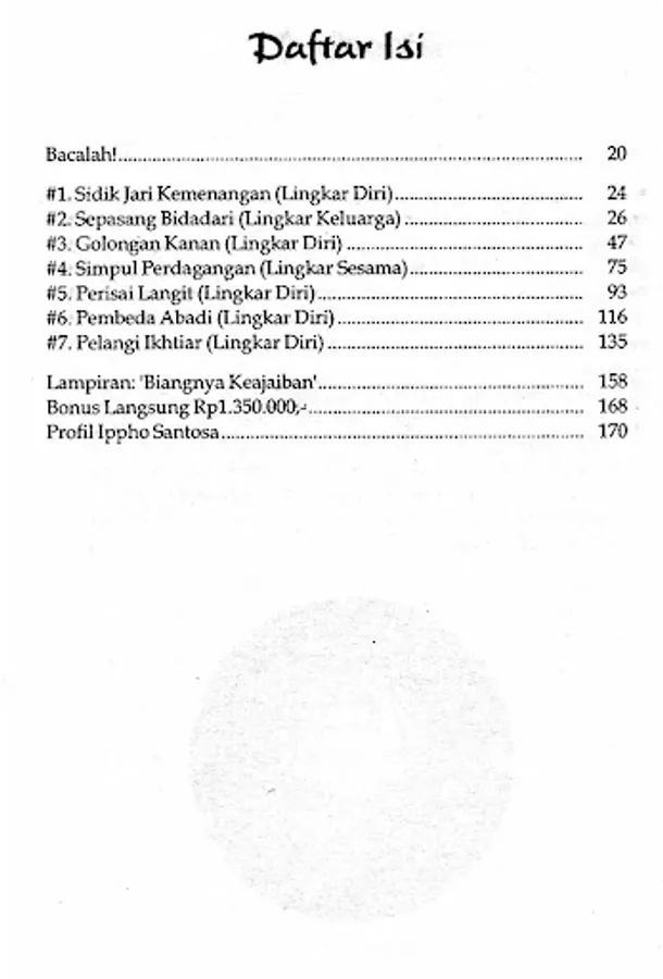 The Circle of Influence starts from the Circle of Self, the Circle of the Family, the Circle of Others, the Circle of the Universe, to the Circle of Creators. The terms just now may make your forehead a little furrowed. Well, there's no rush to drink Panadol. Because you will soon understand it as soon as you touch directly with the miracles listed in this book. Starting from the next page.