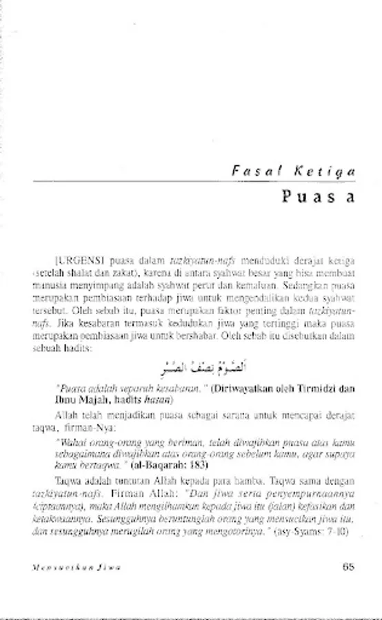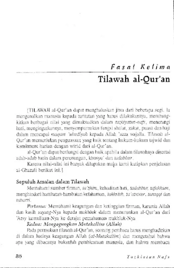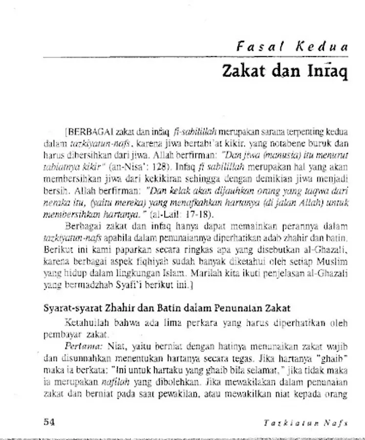 The meaning of Tazkiyatun Nafs in terms is purification of the soul from all diseases and defects, realizing various stations for it, and making asthma' and shifts as its morals. The soul can become pure if we perform various acts of worship (eg prayer, infaq, fasting, pilgrimage, dhikr, and reciting the Qur'an) as perfectly and adequately as possible.