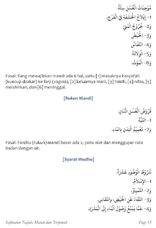 Reader Budiman, this kutaib (small book) from Matan Safinantun Najah is a subject that has been studied a lot by Indonesian students because the author of this matan belongs to the Syafi'i school where he was born in Hadromaut Yemen who moved to preach preaching in Batavia, Java and died there. Studying a madhhab by starting from small eyes is a must for the student of knowledge so that he has a handle and has a little insight into his school of thought, is not rigid in facing mistakes (differences), and has a religion with evidence.