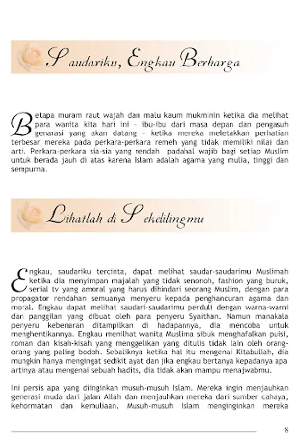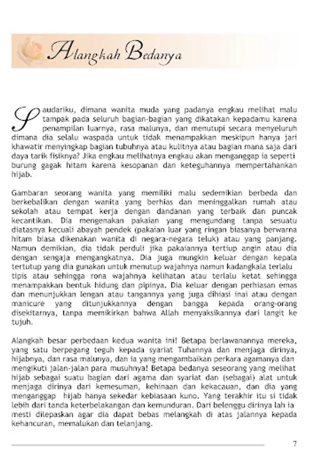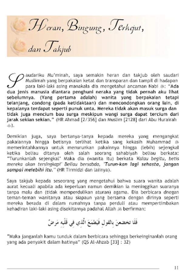 The book that is in front of the dear reader is a sad scream from a Muslim woman, who witnesses the continuous decline that befalls her sister. It is a deep concern, when witnessing how many Muslim women are ensnared in deceit and propaganda launched by the enemies of Islam to damage their honor. How quickly and easily ugliness falls, damage befalls, when the garments of shame have been taken off.