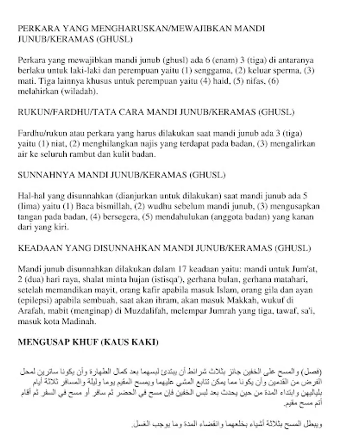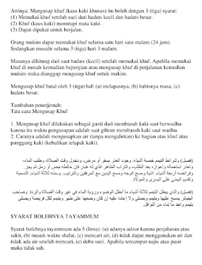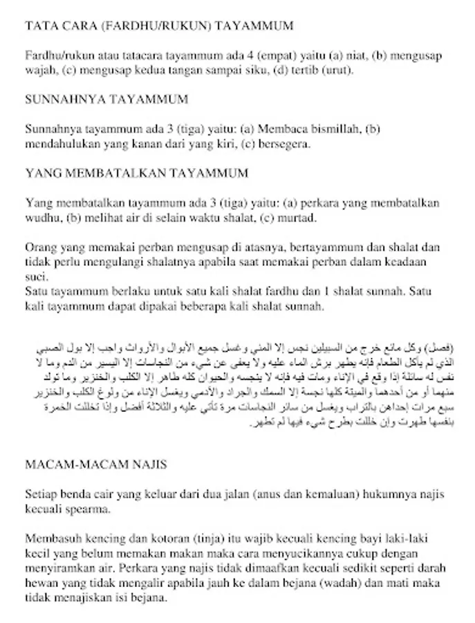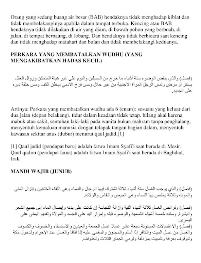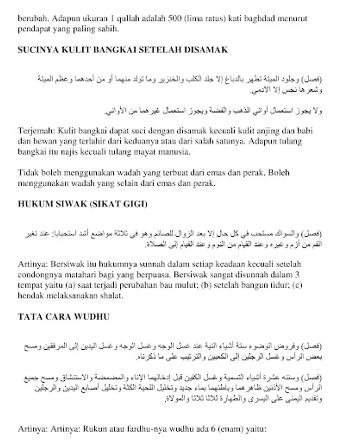 There are 4 (four) types of water, namely (a) holy and purifying water; (b) water that is makruh, namely hot water; (c) water that is holy but does not purify, that is, mustakmal water and water that has changed because of the mixing of holy things; (d) unclean water, namely (i) less than 2 qullah of water that is unclean or (ii) up to 2 qullah of water is unclean and changed. The size of 1 qullah is 500 (five hundred) Baghdadi according to the most authentic opinion.