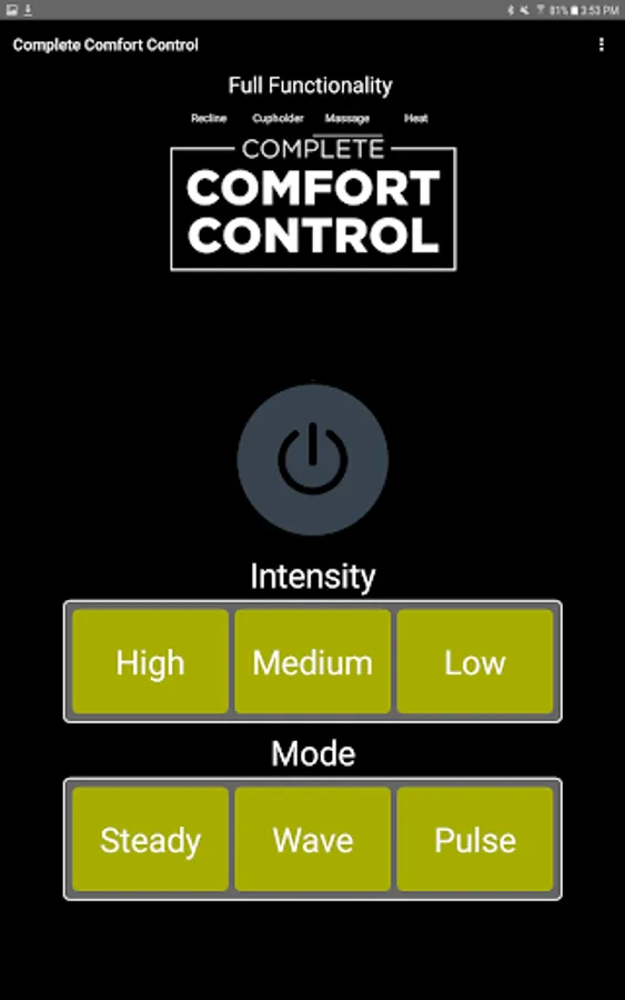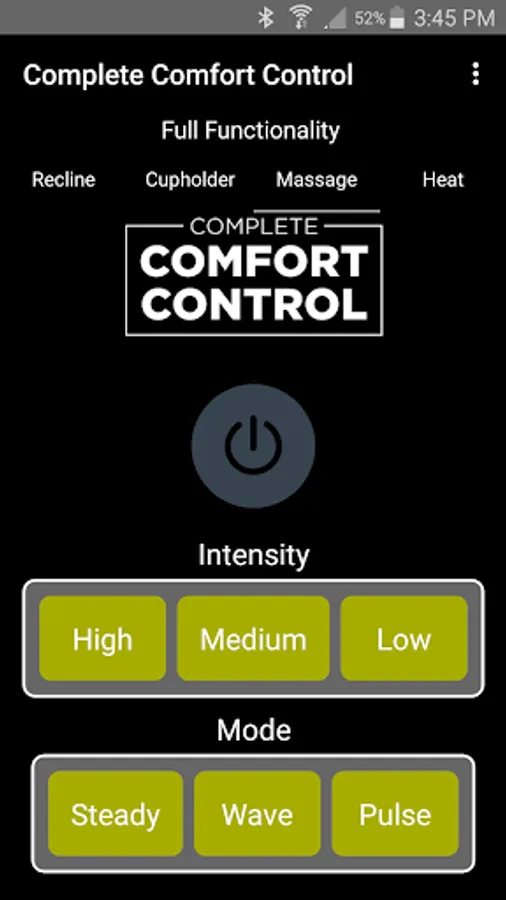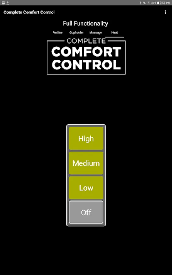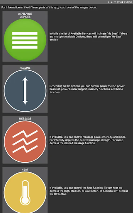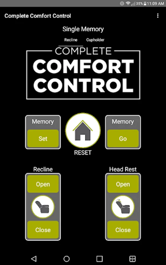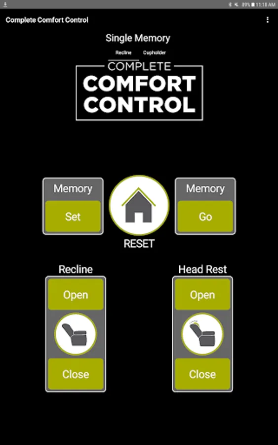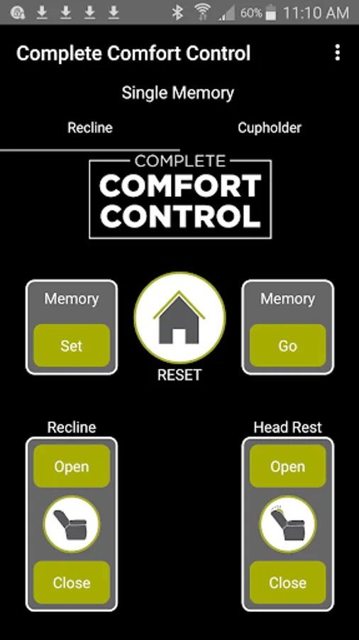 The app allows you to connect to your enabled furniture via Bluetooth from your phone or tablet. Depending on the options, you can control the electric motors that move your chair or sofa and may include power recline, power headrest, power lumbar support, memory functions, home function, light, cooling cup, heat, and massage.