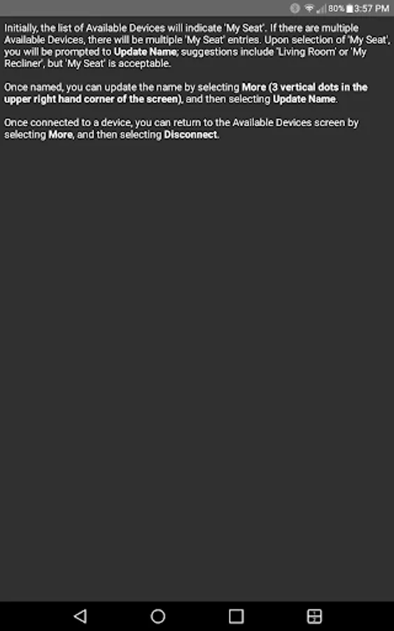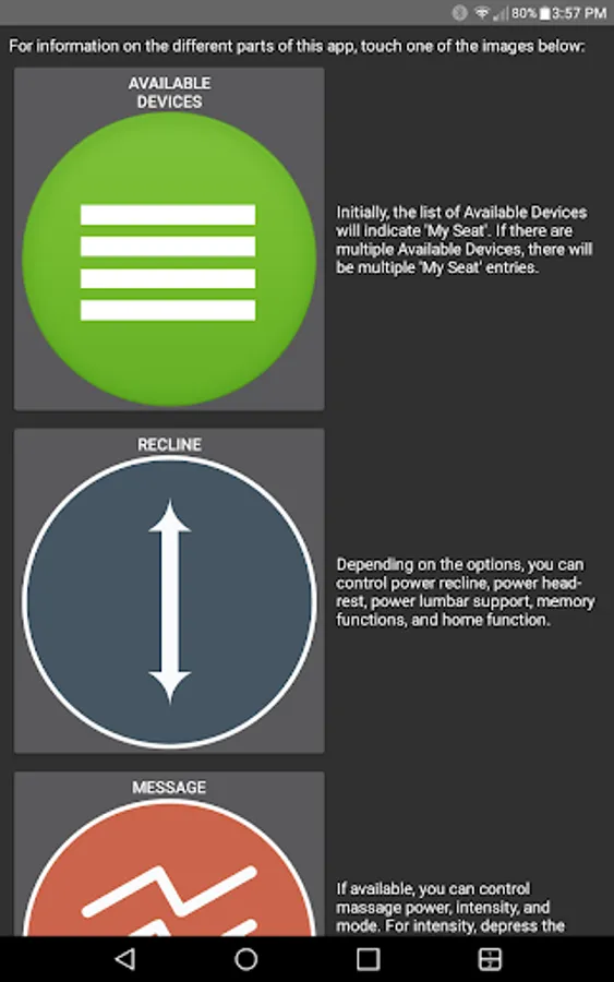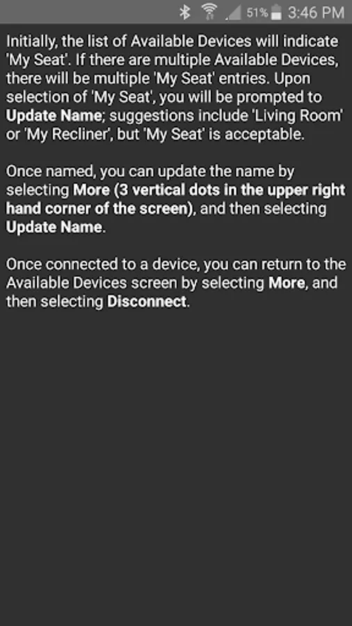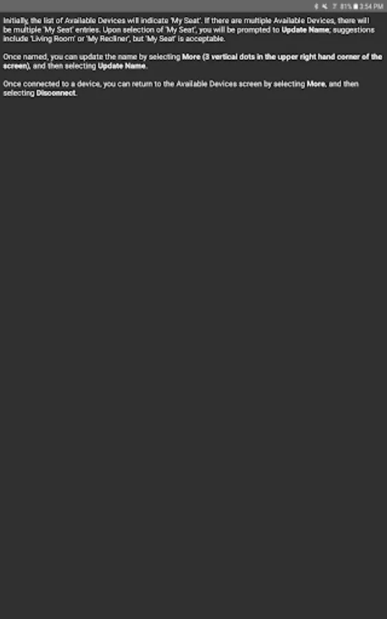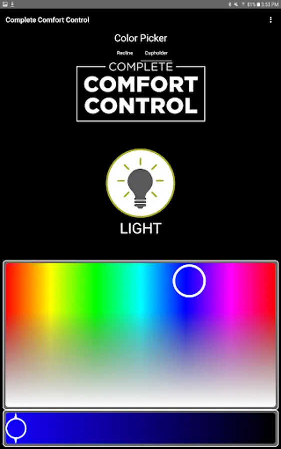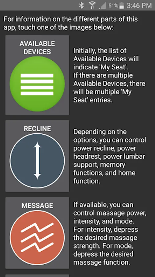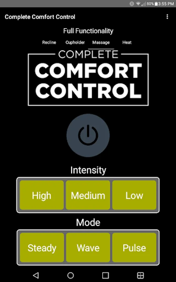 The app allows you to connect to your enabled furniture via Bluetooth from your phone or tablet. Depending on the options, you can control the electric motors that move your chair or sofa and may include power recline, power headrest, power lumbar support, memory functions, home function, light, cooling cup, heat, and massage.