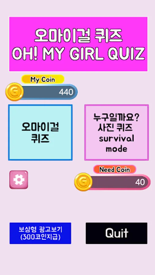The picture quiz requires a coin and it is the end of the game if one problem is called survival game.