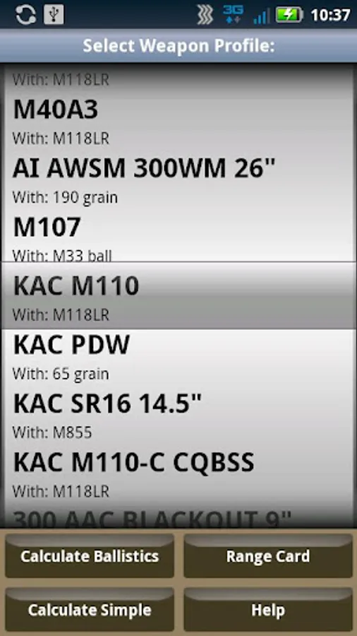 Several built-in profiles for the Army's M110 semi-automatic precision rifle, the 14.5 inch SR16 rifle, The 50 BMG M107, .308 M40A3, .308 M24, and the 6.5mm KAC PDW allow you to get started quickly. You may alter these profiles, or add new ones.