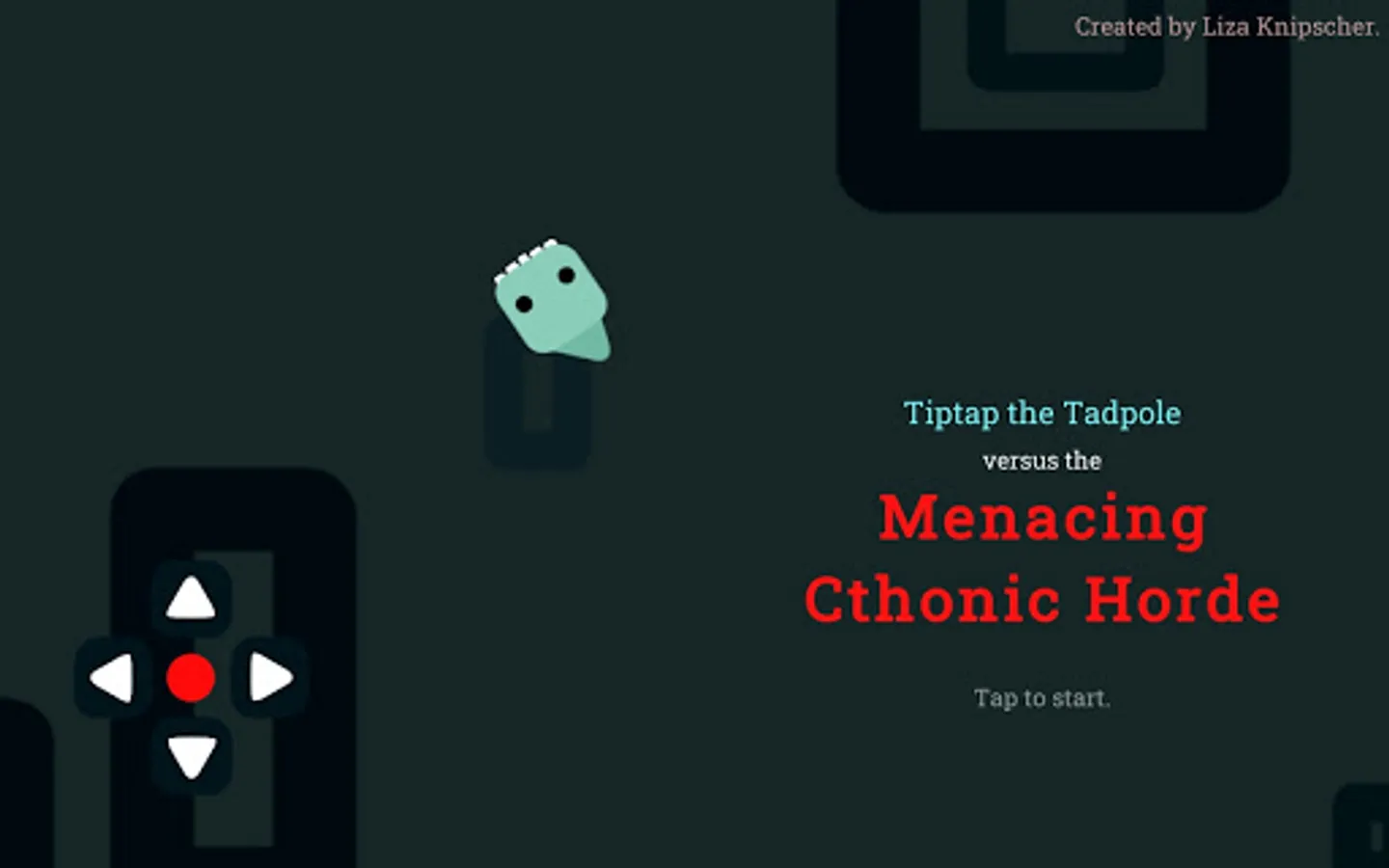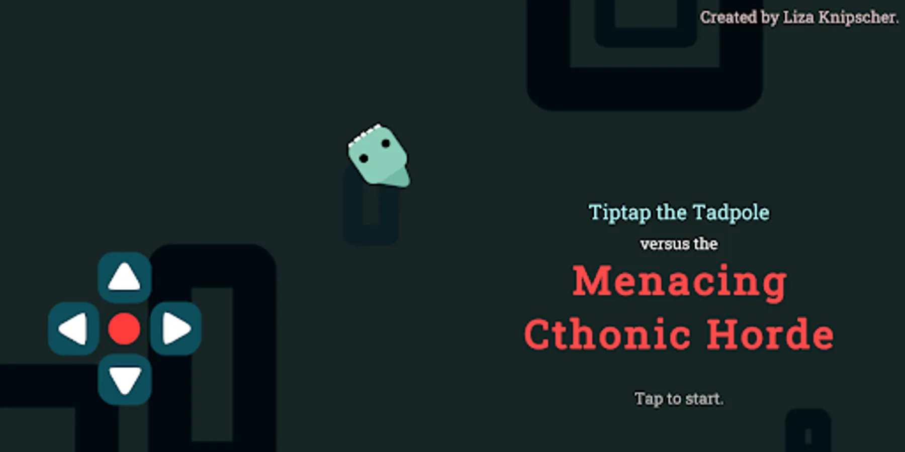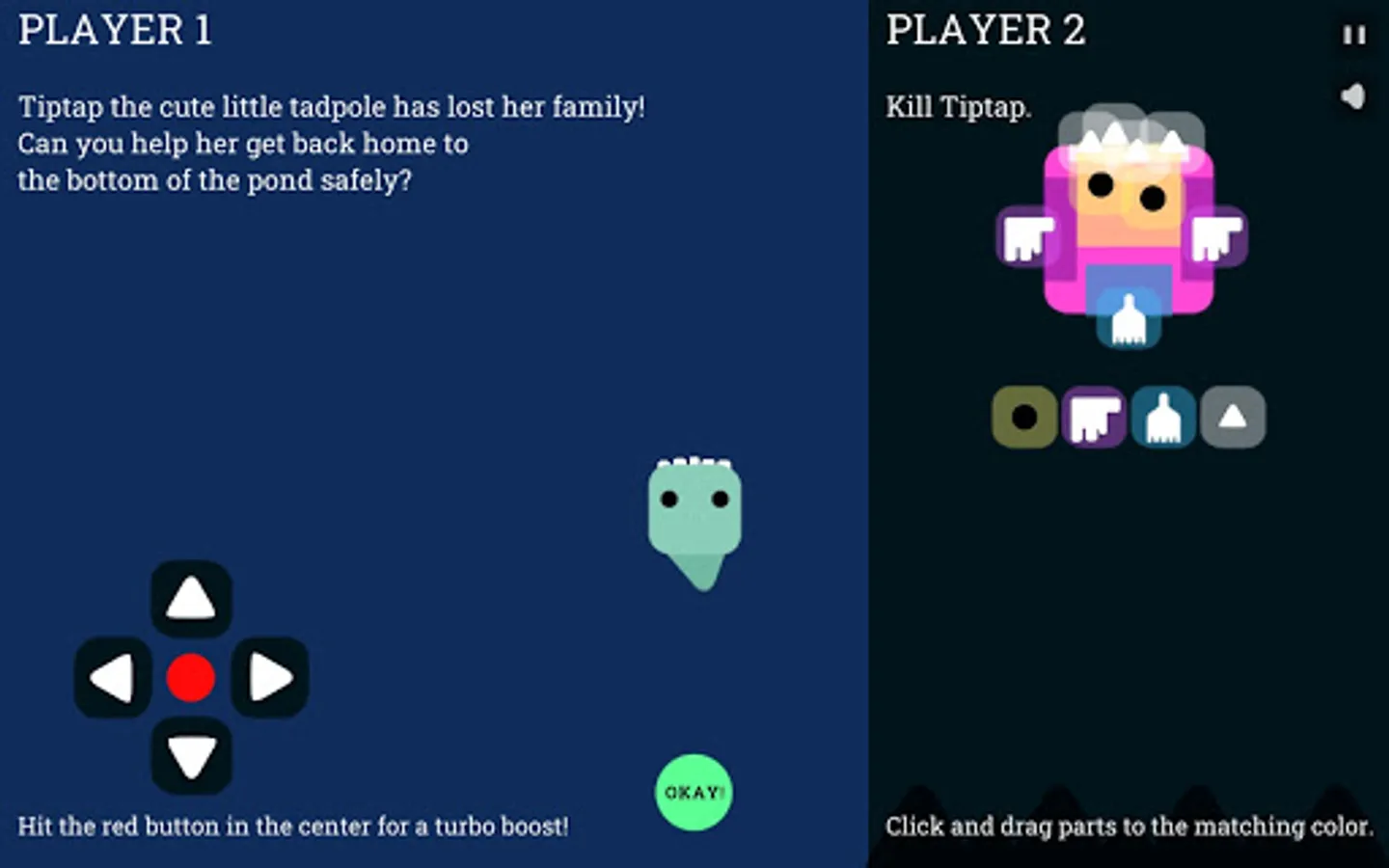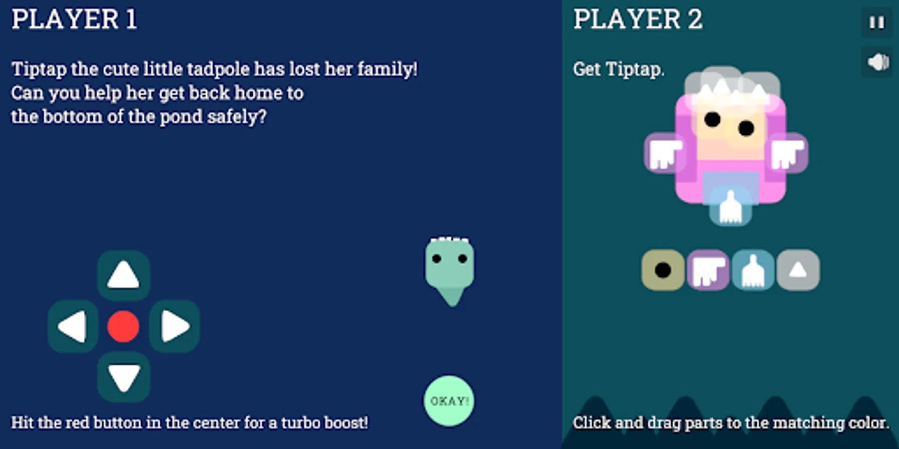 Tiptap the Tadpole is lost! She needs to find her family at the bottom of the pond, but a horde of pond monsters are trying to eat her. Player 1 controls Tiptap on the left half of the screen, while Player 2 builds monsters on the right half. Will Tiptap make it, or will the monsters catch her first? It's up to you! (And also you!)