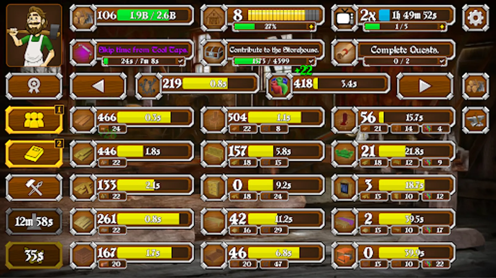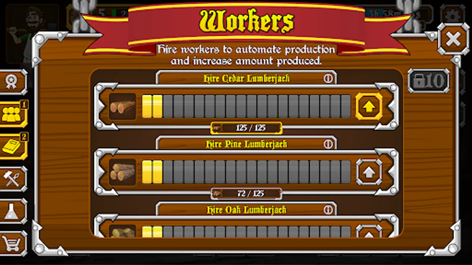 Expand your workshop as you hire Workers, increase their Training, upgrade Tools and complete Research. Gather materials and craft objects in this idle crafting game.