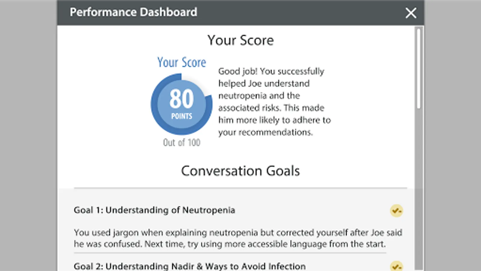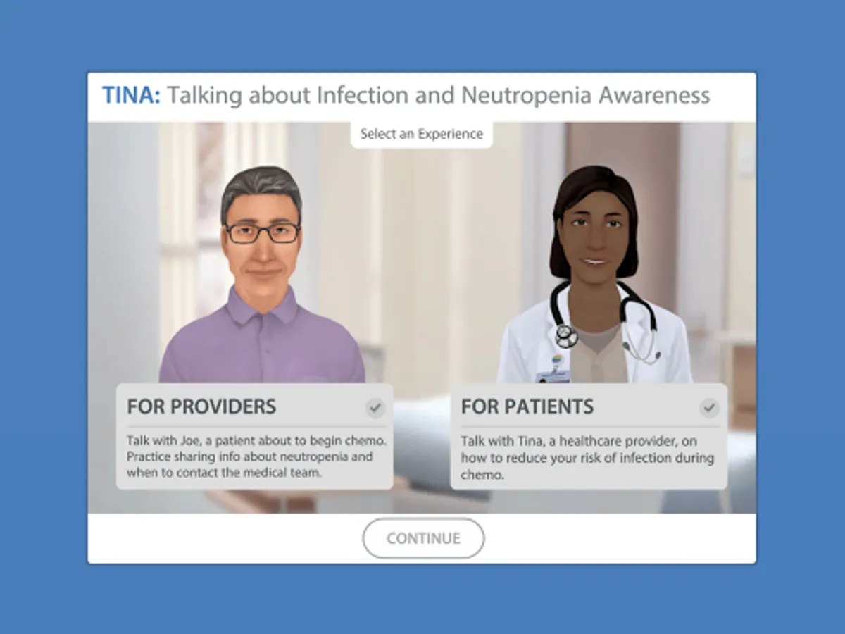 For healthcare providers: practice sharing information about neutropenia with your patients through an interactive conversation. Play the role of Tina, a virtual oncologist, and learn how to quickly and effectively have this conversation to achieve better adherence and outcomes. Then meet a virtual patient and practice a realistic conversation.