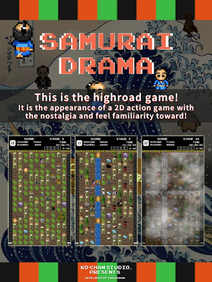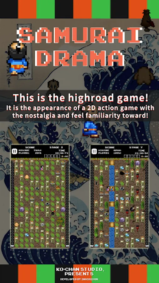 It's a 2D action game using fun pixel art with an authentic Japanese style!