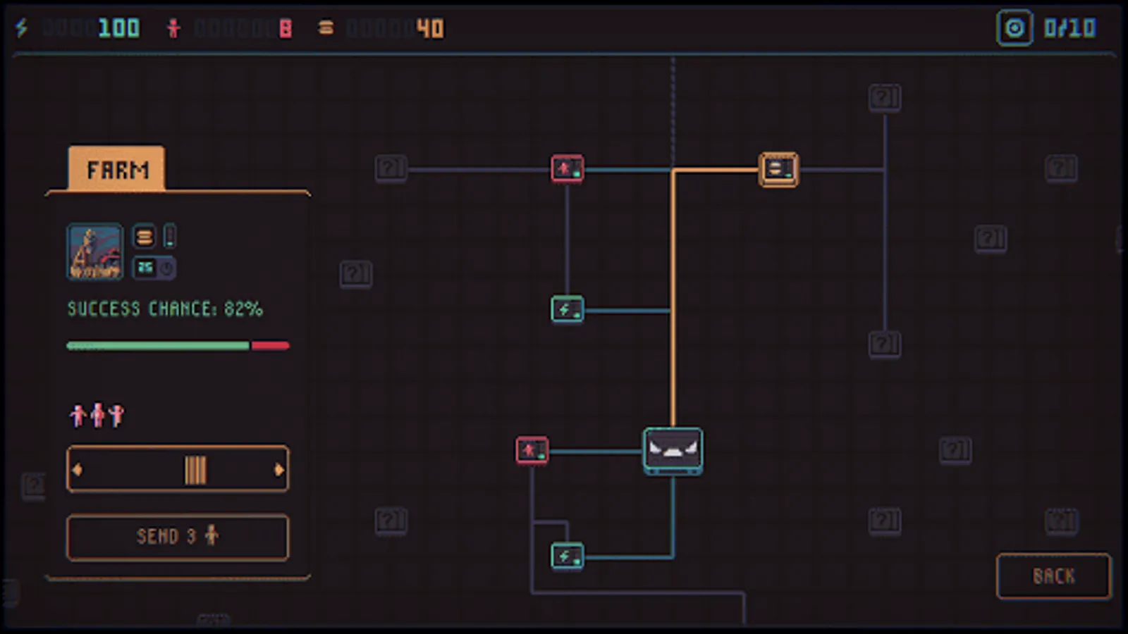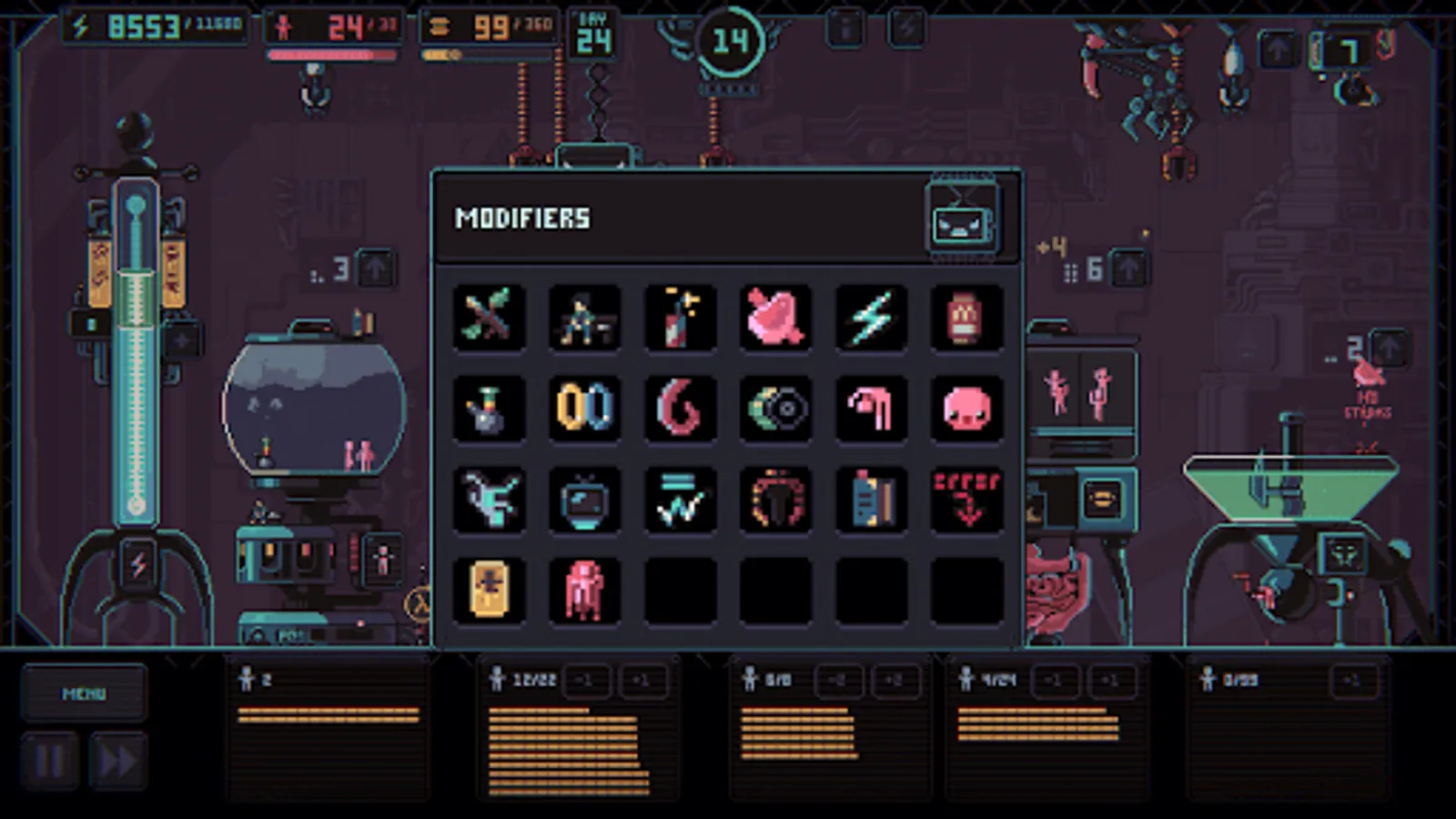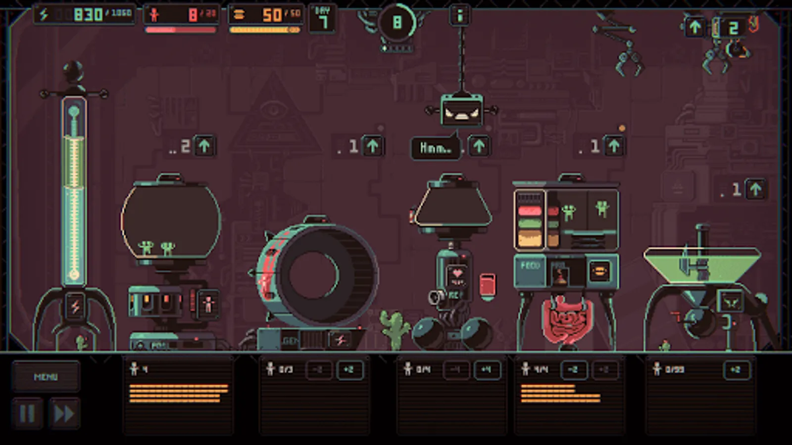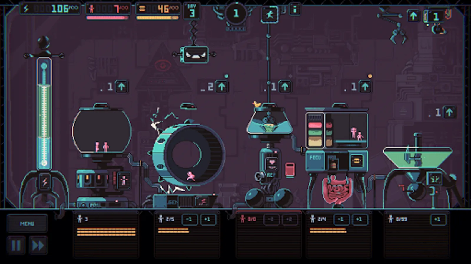 Core gameplay consists of transporting puny humans between various facilities using mechanical claws. They rest in one of the facilities and work in all the others. Puny humans are to produce energy for us (which is leaking constantly), they also have to reproduce and feed themselves. You need to plan your strategy and tactics in advance and track all your humans so that they don't die of exhaustion. The foremost roguelike element is that you can't save the game - you have to start from scratch every time. Besides that, a random event happens after every five feedings in the form of a text quest. A correct choice may provide some bonus, an incorrect one - well, you'll see! Many of the modifiers that you get due to the random events change the game's look significantly.