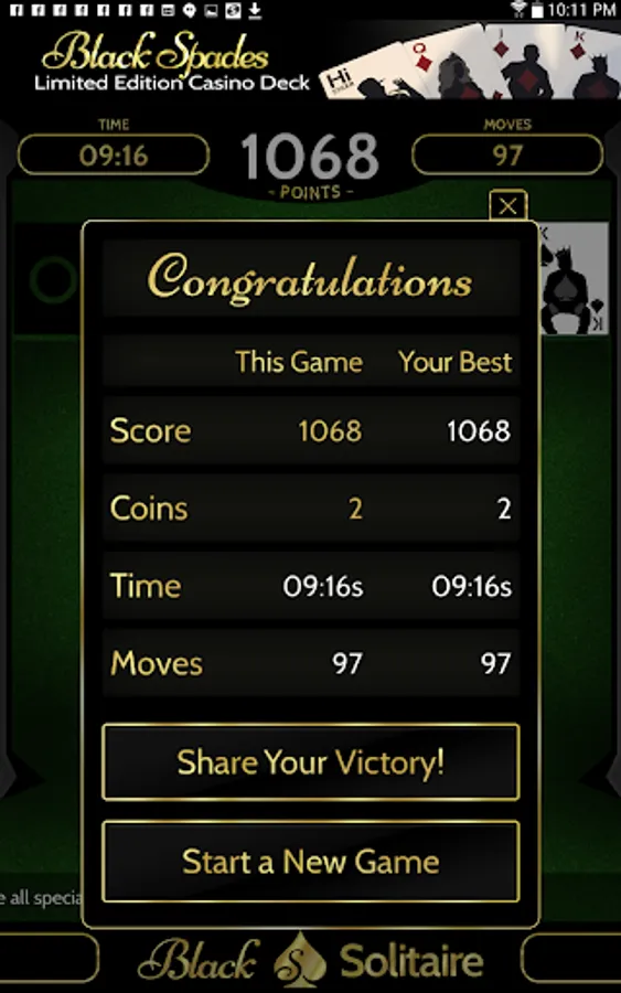 3. Social Sharing - Black Solitaire was created to easily show off your Solitaire skills with friends and family. Share your times, moves and points via your favorite social media platform, email or text message.