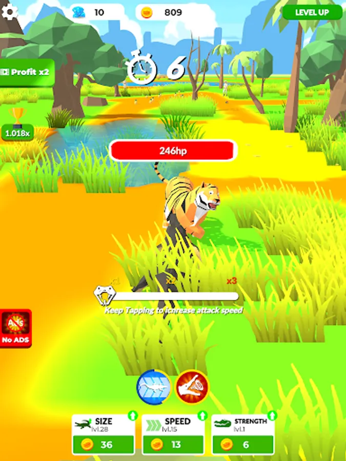 It’s crucial for your idle crocodile to evolve to dominate its habitat. Realize that you're not the sole apex predator of the wetlands! Just tap and grow, stalk and consume. Each marsh creature offers unique bonuses to augment your earnings and might. Advance your reptile into a Nile crocodile or even a fearsome Saltwater crocodile! Their powerful 3D snouts are ready to snap! Enhance your creature’s speed on land and in water, and boost its attack and resistance capabilities.