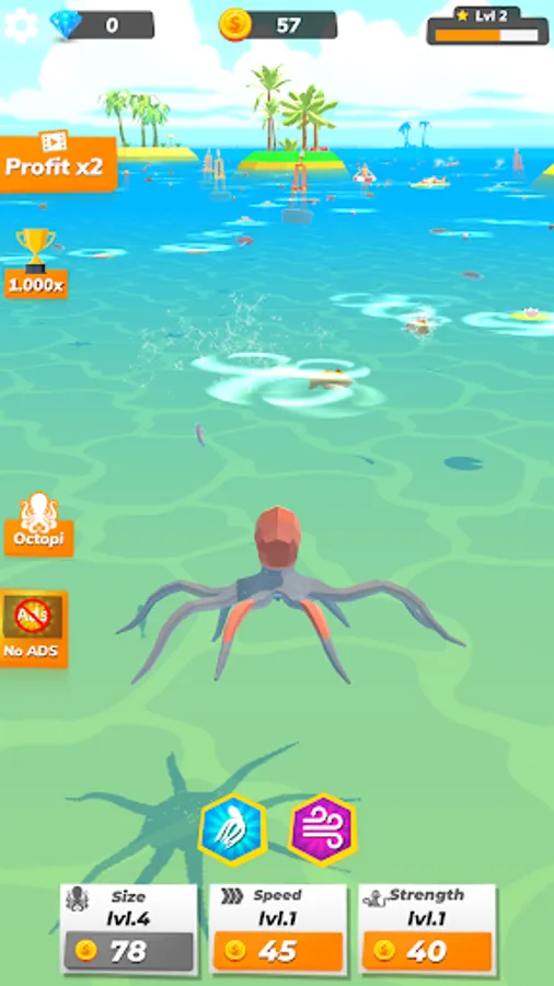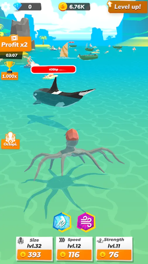 Want to create even more destruction and chaos? Upgrade your octopus to increase its tentacles strength and attack power. Grow your monster to eat more significant objects. Level up your beast to grow its speed and swimming velocity. Increase the health and attack damage of your hungry dragon. Earn better points to improve your octopus game stats. Gain experience by catching and eating your prey. It will be a bloody mess!