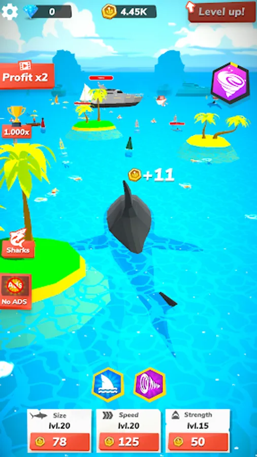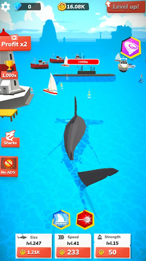 Want to create even more destruction and chaos? Upgrade your shark to increase its jaws strength and attack power. Get sharper teeth and grow your monster to eat more significant objects. Level up your beast to grow its speed and swimming velocity. Increase the health and attack damage of your hungry dragon. Earn better points to improve your shark game stats. Gain experience by catching and eating your prey. It will be a bloody mess!