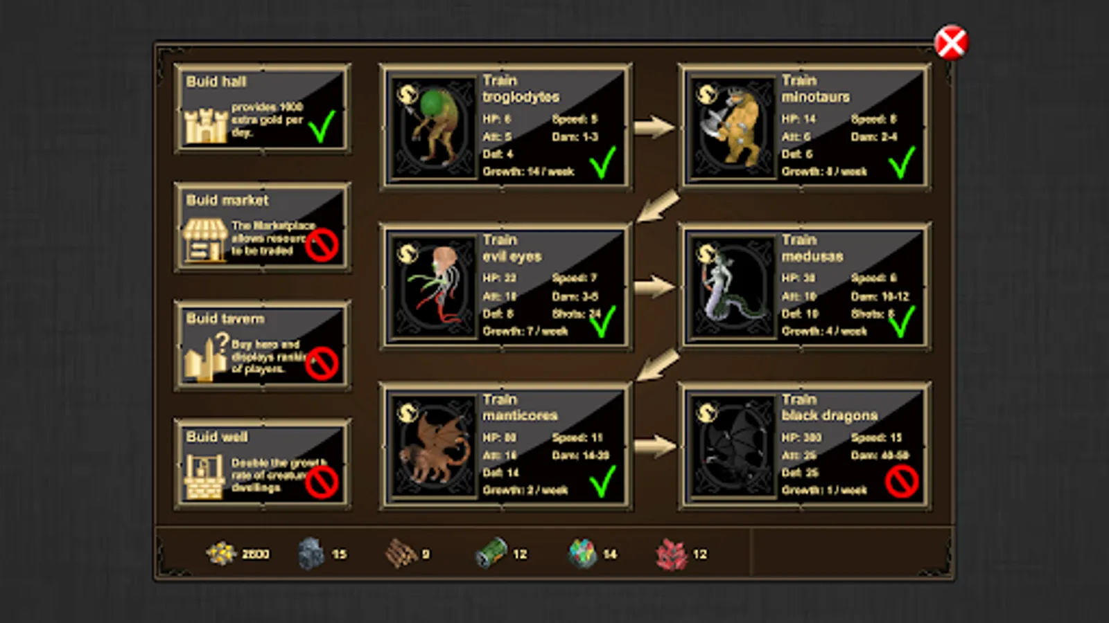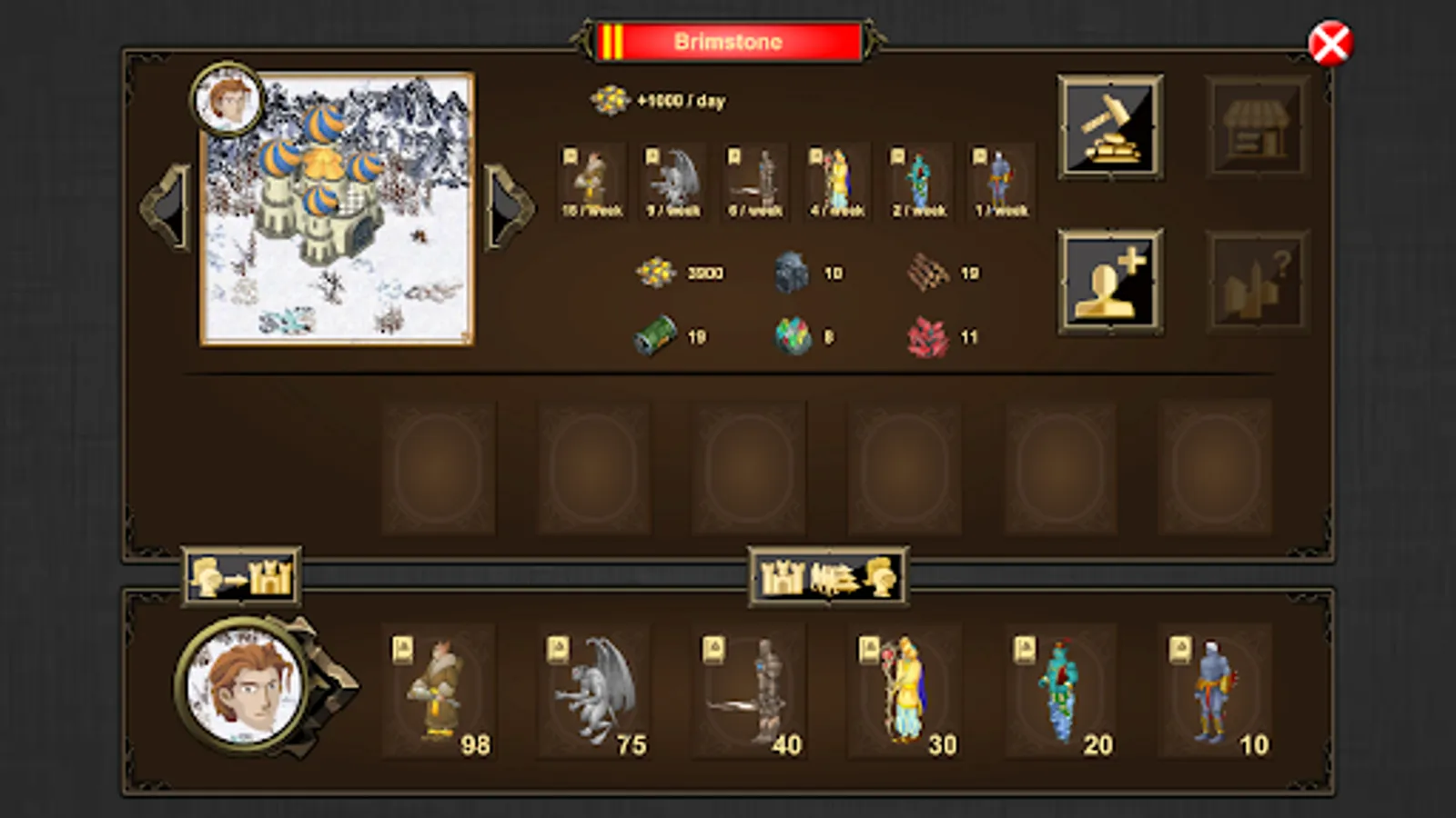 Players begin a game with one town of a chosen alignment (Paladin, Overlord, Necromancer, Daemon, Wizard). Each town alignment hosts a unique selection of creatures from which the player can build an army.