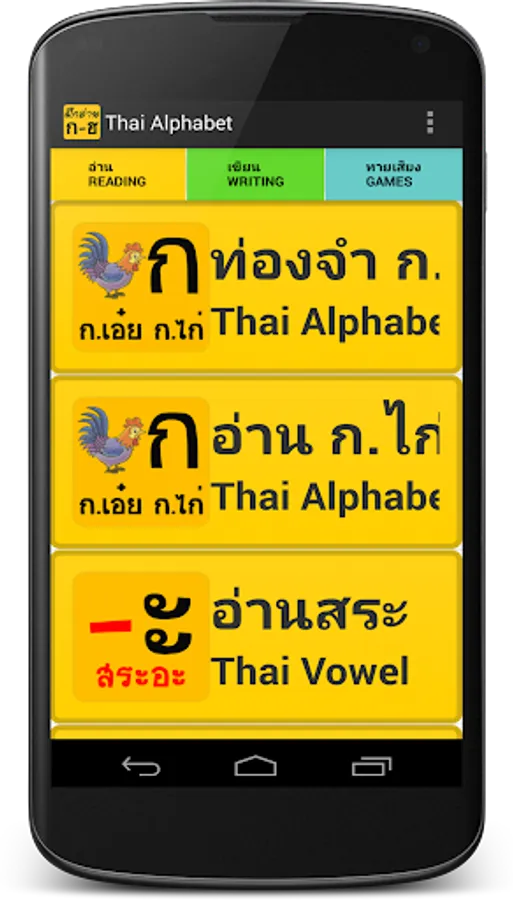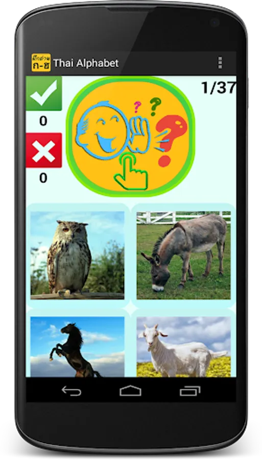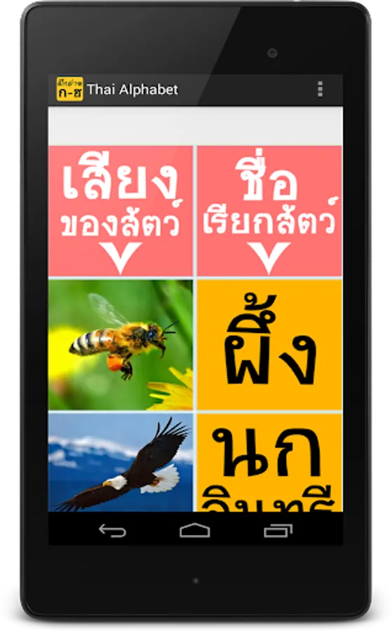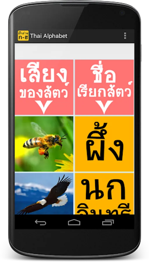To help the remember of the players From the sound that comes out will have the option to 4 options to choose the correct answer to keep score, divided into 3 different competitionsThai consonant 44 sounds, vowel 32 sounds, Numbers 20 sounds