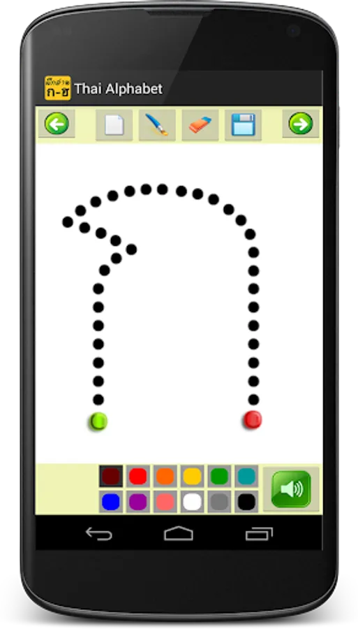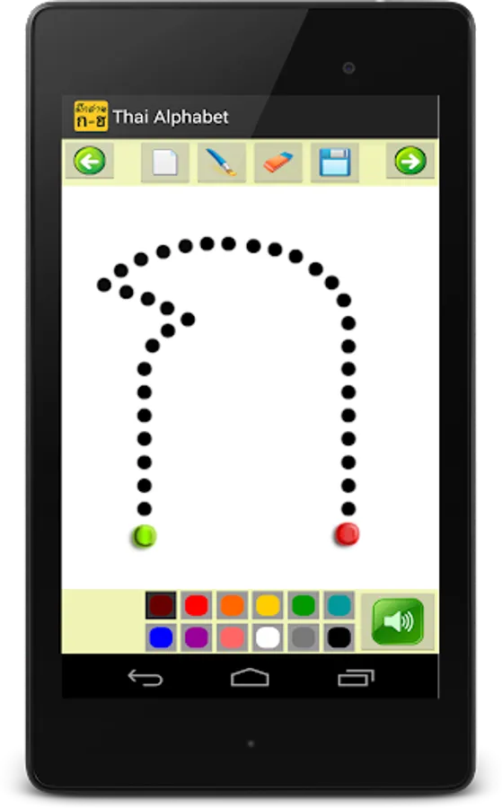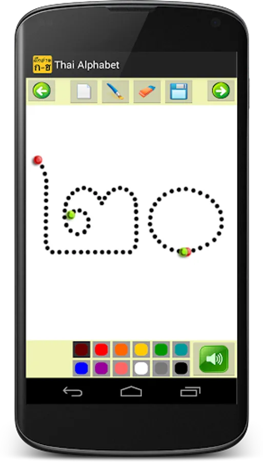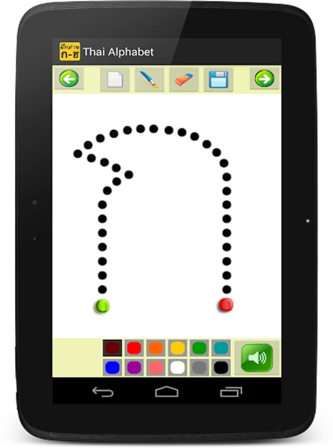 In the practice of writing application with a stroke, according to a patch consonant Thailand. 44 characters from a. Chicken to Owl by dragging it to drag from the green to the red dot. A line drawn by another vowels 32 patches and a line drawn number 1-20.