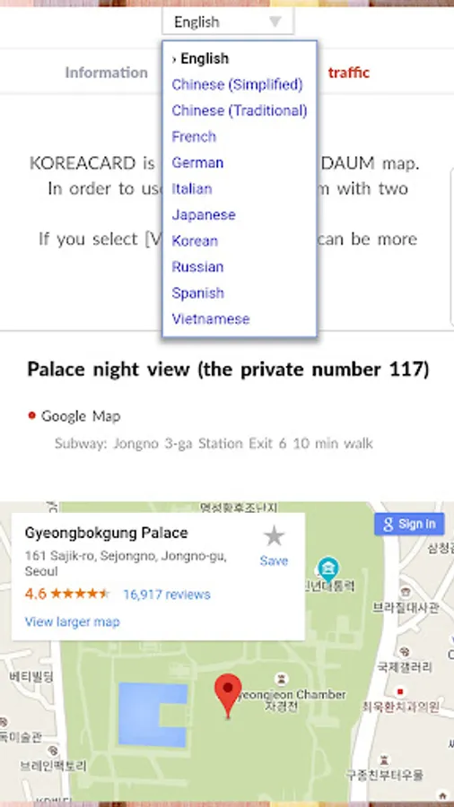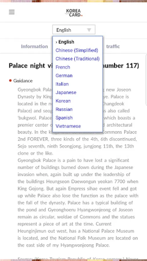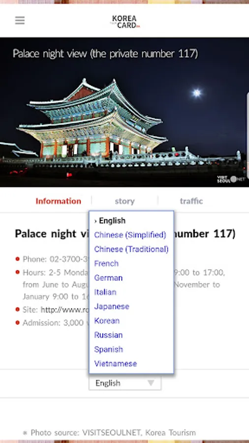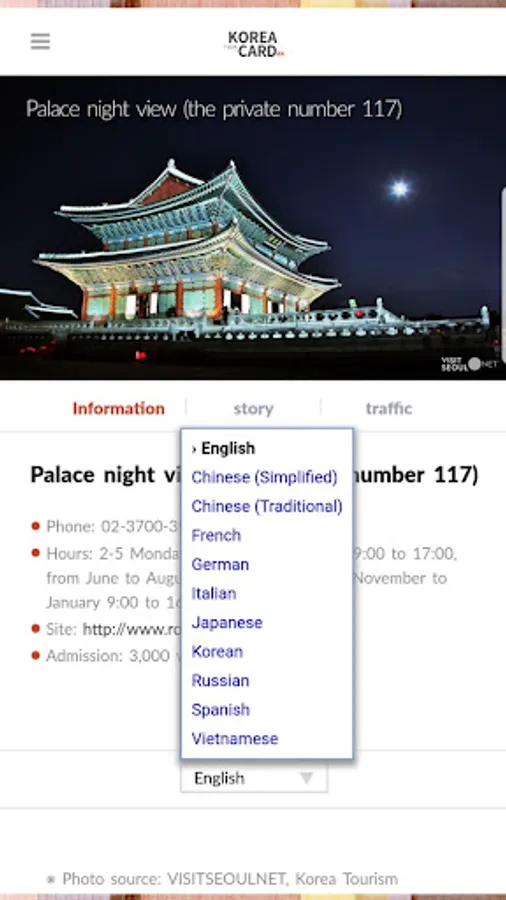 코리아 카드 (KOREA CARD)는 관광지의 상세 정보 (관광지의 사진, 전화번호, 사이트, 관람 시간, 요금, 관광지의 상세 정보, 교통편, 지도 등)를 한국어 포함 11개 국가의 언어(한국어, 영어, 중국어(간체), 중국어(번체), 일본어, 독일어, 러시아어, 프랑스어, 스페인어, 이탈리아어, 베트남어)로 서비스합니다.