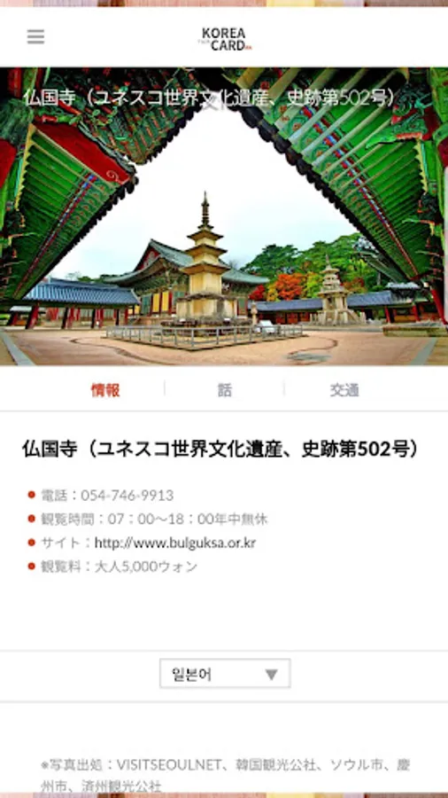 한국을 방문한 외국인들은 코리아 카드 (KOREA CARD) 앱을 통해 한국 주요 관광지의 정보를 쉽고 정확하게 만나볼 수 있습니다.