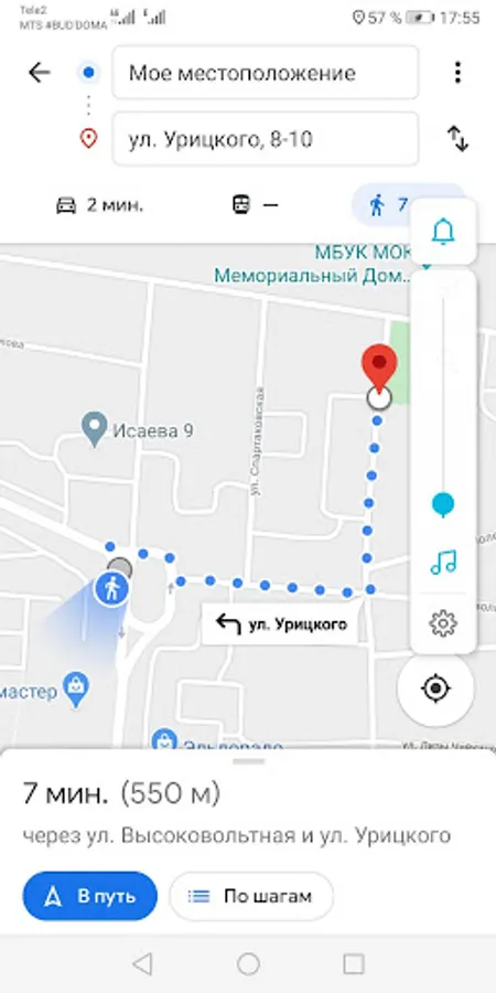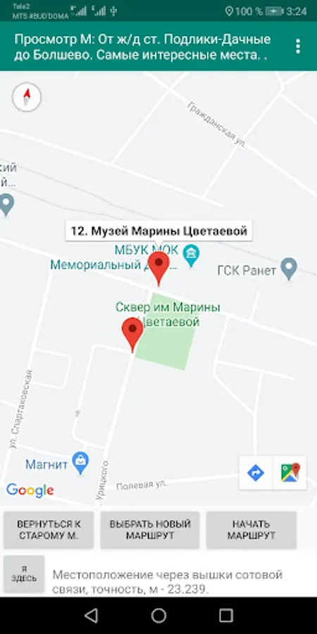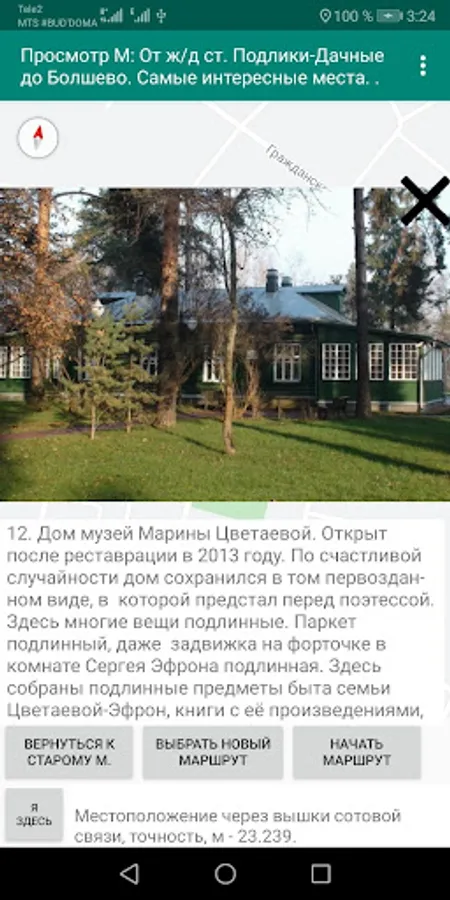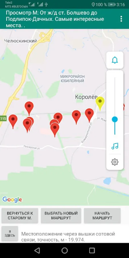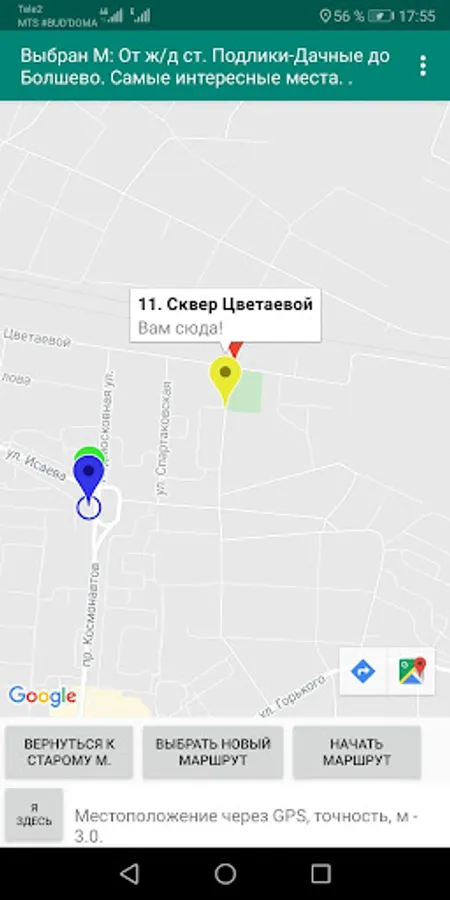 The walking route and the quest for the historical and most interesting places of the city of Korolev are presented in the form of a sequence of markers on the map, which are numbered and have a brief historical description, if you click on them. As you approach the next point, which is displayed with an orange marker, your location on the map will also move to this point in the form of a blue marker, and at one point, the orange marker will turn green and it will have the signature Passed. In this case, the next marker turn from red to orange. This way you will always know where to go.