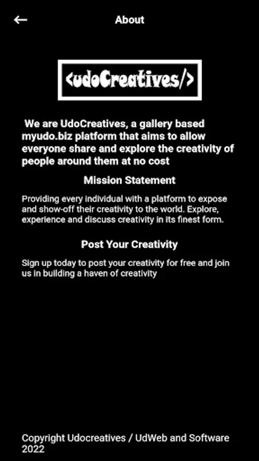 Aspiring to be Earth's leading mobile creative gallery, our mission is to provide a free platform for individuals to showcase their creativity and build a gold standard database. We want to make sure that no one goes through their journey of creativity and creative growth alone. With UdoCreatives, you'll have access to a virtual gallery featuring a diverse collection of artworks, illustrations, and designs etc. from creatives around the world.