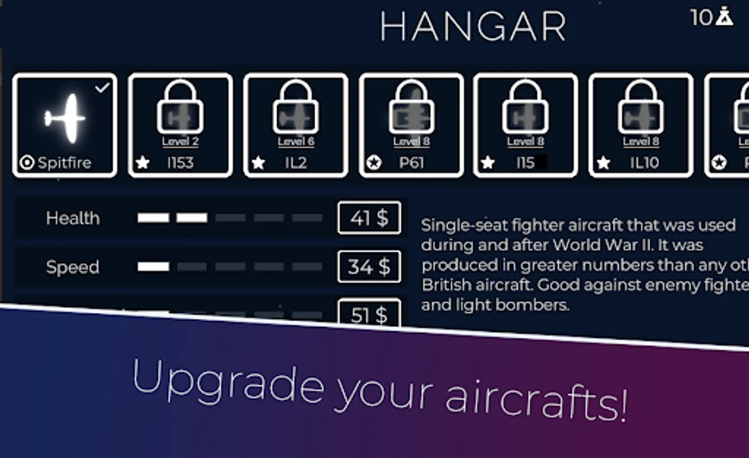 Fight for different countries like UK, USSR, USA, in next uptades we also planned to add some Swedish airplanes. Here you can find the most famous planes like Spitfire, P-38, IL-2 etc., and also learn more about secret projects and vehicles, some of which were constructed after World War 2.